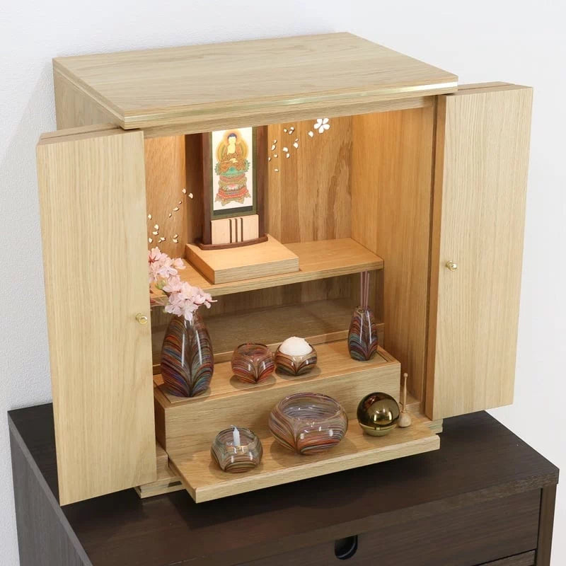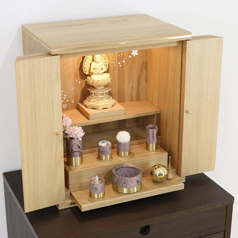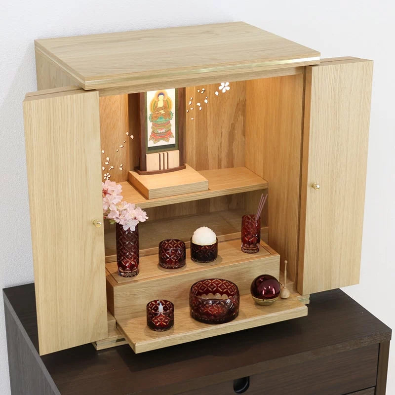 ルミエールオリジナルの桜柄のモダン仏壇。北海道旭川の国内工場で生産した高品質な純国産仏壇。