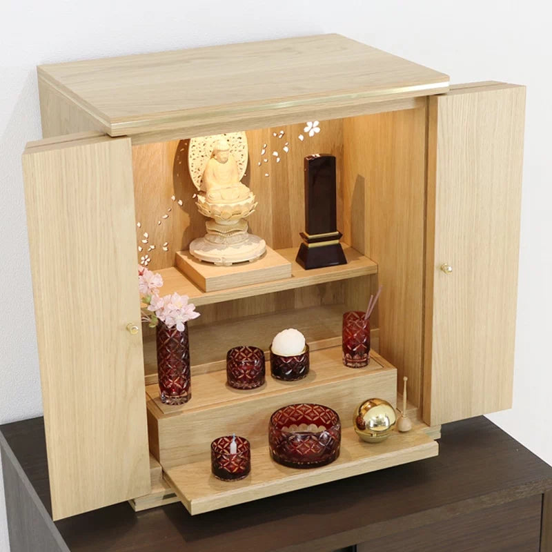 • 旭川モダン仏壇「陽桜」に設置した例。切子の深い赤が、お仏壇に色どりとアクセントを与えています。