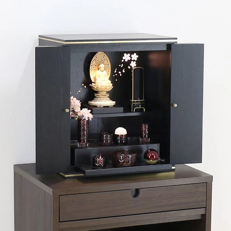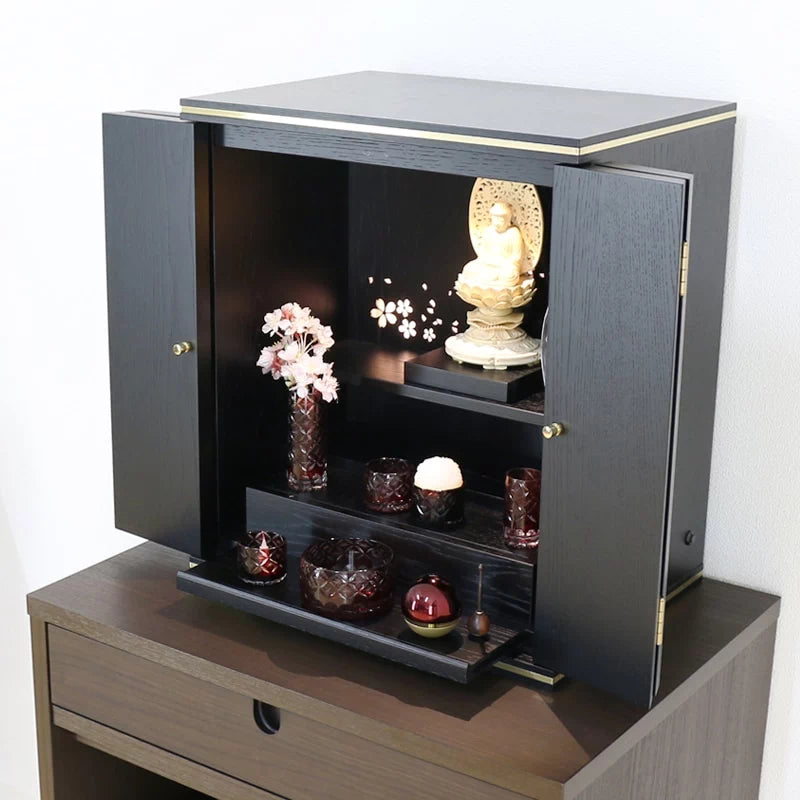 • 旭川モダン仏壇「夜桜」に設置した例。お仏壇の色とお位牌の色を黒で合わせ、仏具とおリンの赤がポイントになっています。