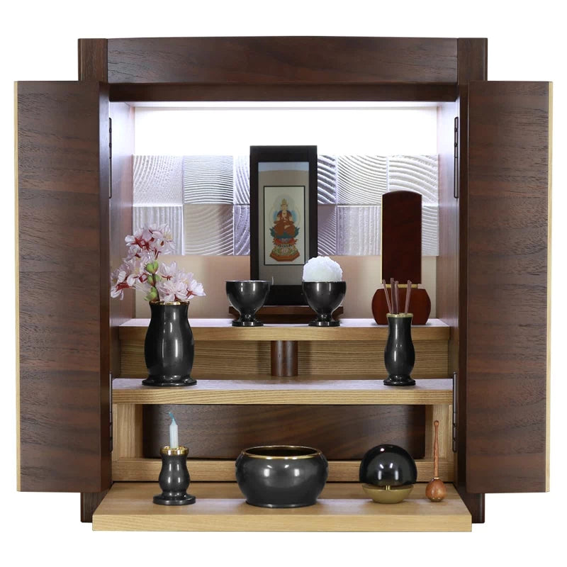 お仏壇に仏具一式を飾りつけたお飾り例です。モダン仏壇は仏具の飾り付けは必要最低限の仏具5~6点セットの「仏具セット」+「おりん」を飾るのが一般的です。