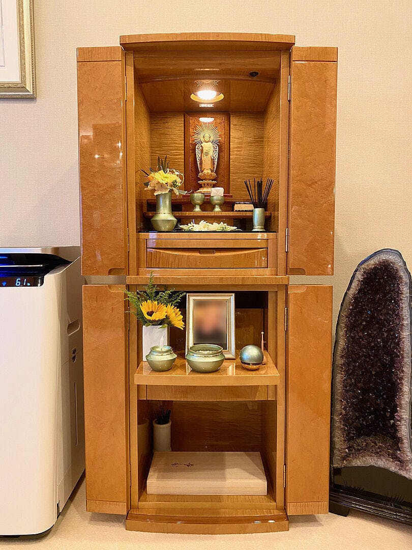 この度はご遠方よりご来店いただきまことにありがとうございました。トータルのコーディネートが上品でとても素敵です。アシッドオレンジとヒマワリがお仏壇をぽっと温かな雰囲気にしてくれていますね。アフターフォローもしっかりさせていただきますのでお困りのこと等ございましたらお気軽にお問い合わせくださいませ。ありがとうございました。