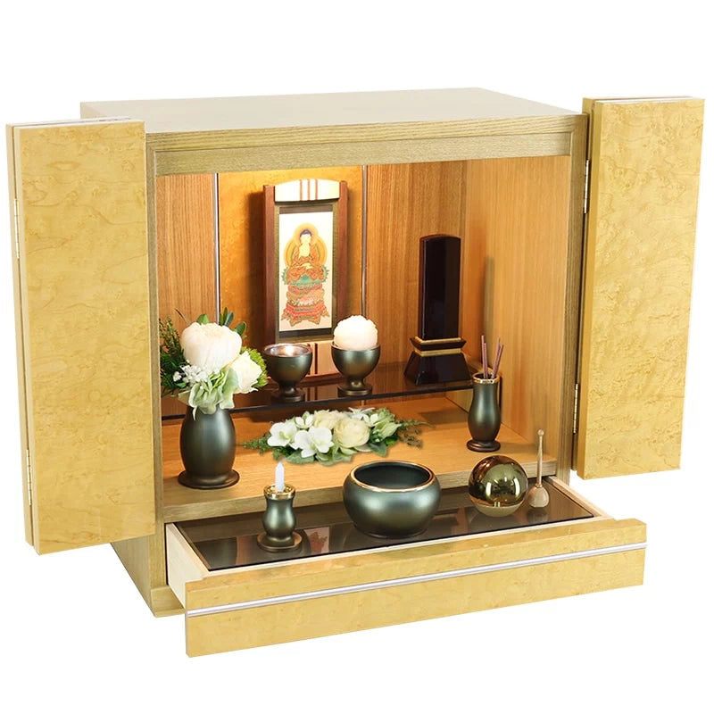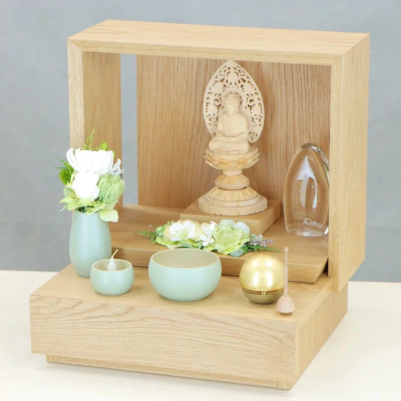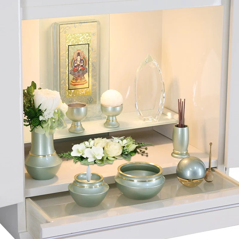 • ミニ仏壇 KAKOI オークとの組合せイメージ。同系色のグリーンの仏具とさわやかなホワイトカラーのピュルテホワイトがよく映えます。
