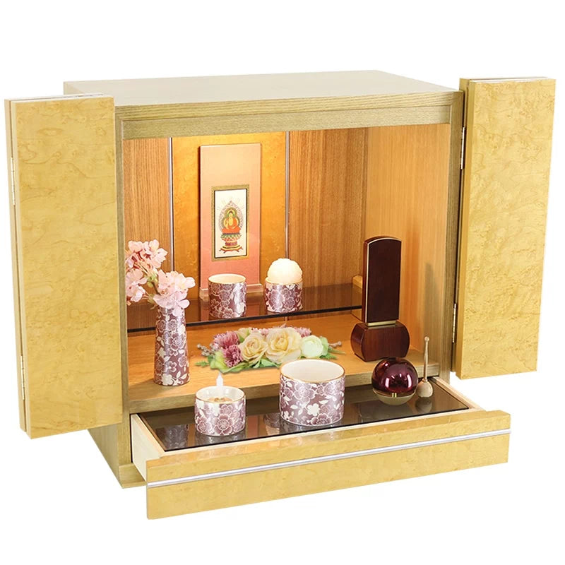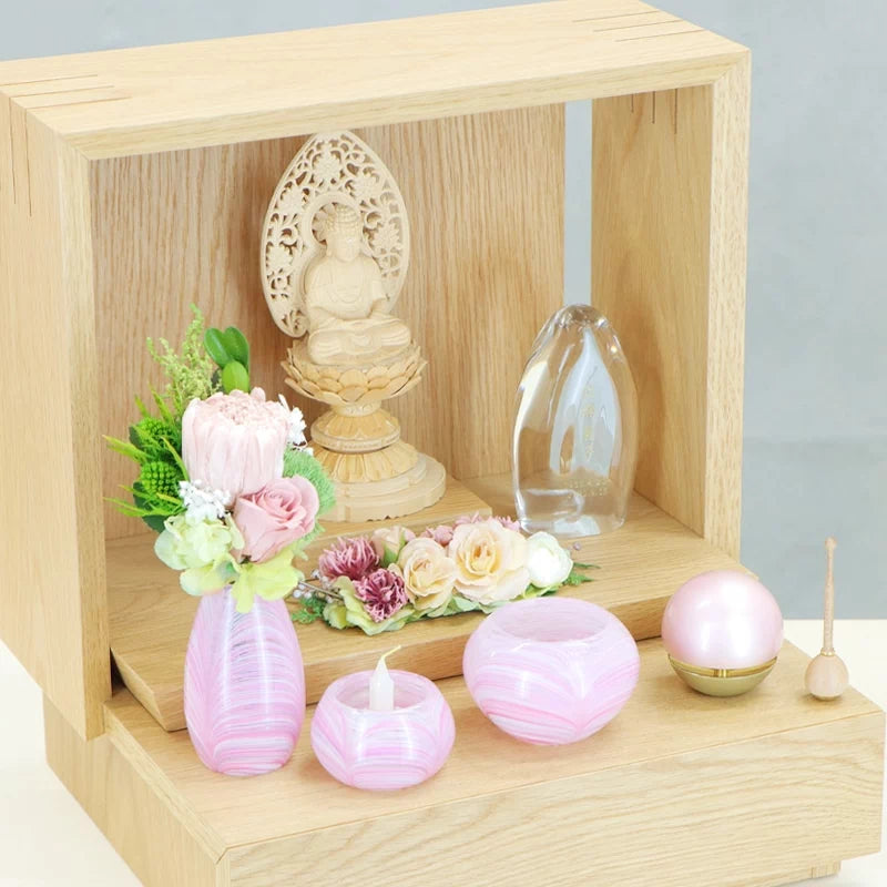 • ミニ仏壇 KAKOI オークとの組合せイメージ。ルミエールオリジナルの津軽びいどろsakuraのかわいらしい色合いとも、たいへん合う組み合わせです。
