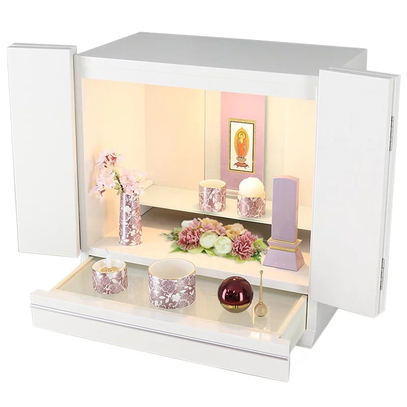• モダン仏壇 アンジュ ピンク 15号への設置イメージ。本尊・仏具・おリンとピュルテをピンク系で統一したコーディネート。白い仏壇にかわいらしいピンクの色が映えます。