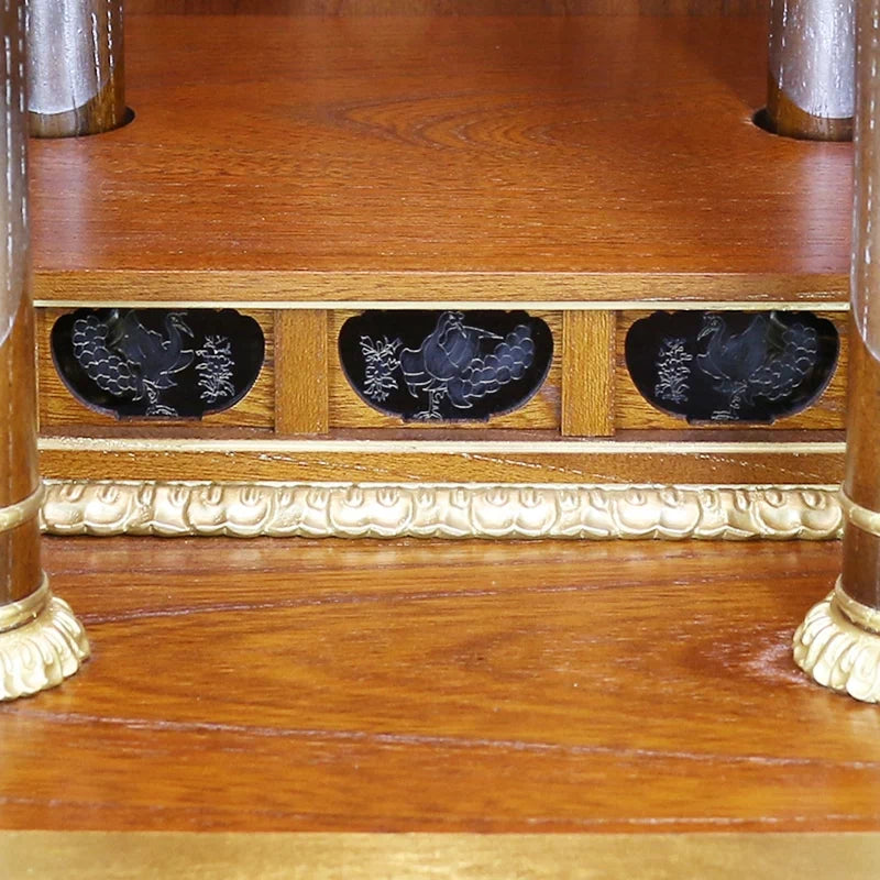 下台には収納スペースがあり、納骨前の骨壺もしっかりと収まるように設計されております。木材は国産の欅(ケヤキ)を使用しており、日本の広葉樹材では1番の良材とされ、寺院建築にも使われる高級木材となります。