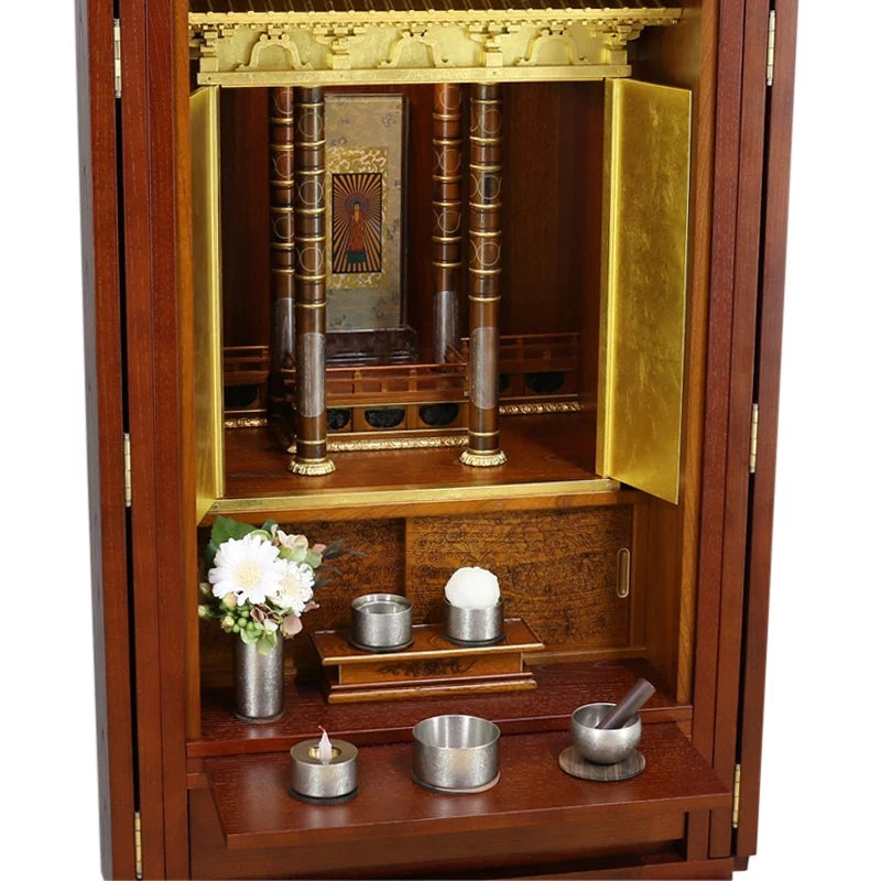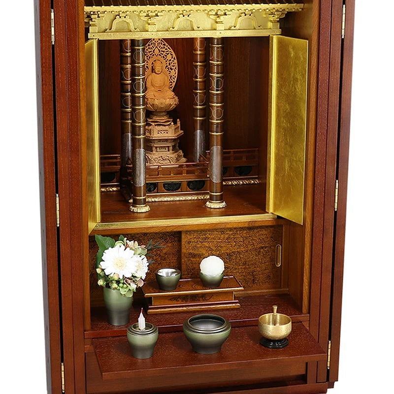 • 特 徴: 国産品 、 LEDライト 、 引き出し収納 、 仏具板 、 柾目の直線が多めの木目 、 床置きタイプ 、 セット仏壇の仏具シュミレーションあり 、 7寸骨箱収納可能 、 扉スリム設計