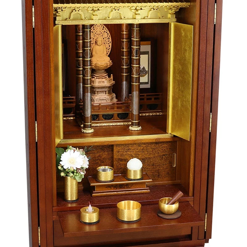 本尊には、桧木仏像の六角台座と、スタンド掛け軸をセットしました。仏具は、お仏壇の中扉と合わせて、金色の仏具セットをチョイスしました。お仏壇の金色をさらに引き立てる豪華さがあります。おリンは仏具と同シリーズのものを合わせました。