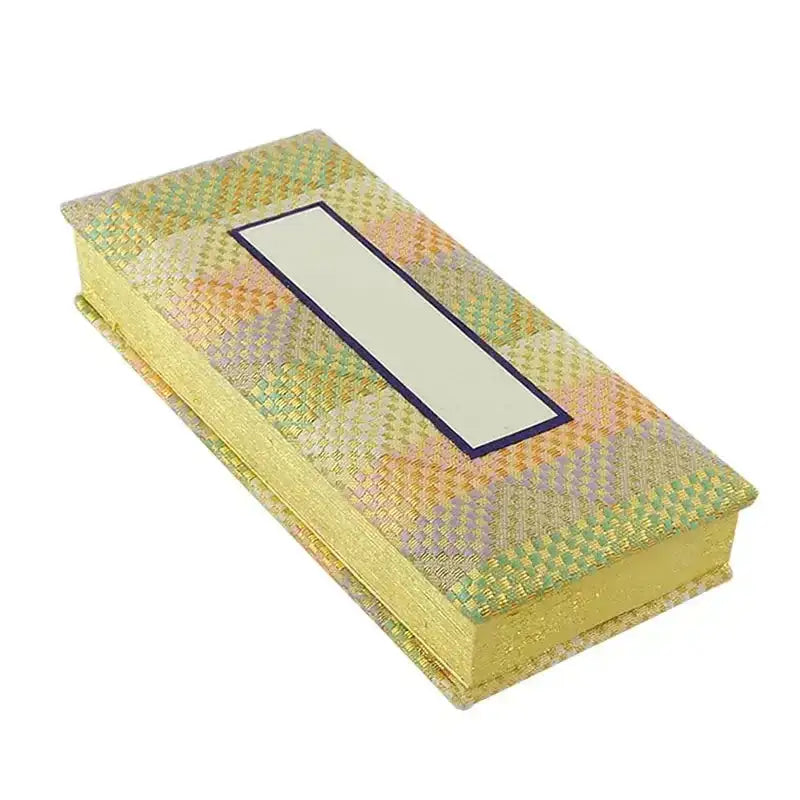過去帳はご家族の戒名などを後世に残す大切な仏具です。モダン金襴過去帳は、あたたかみのある織物製で、色鮮やかな糸と金糸を編み込んだ布織物が張られており、モダンなデザインがさまざまなお仏壇にマッチします。モダン金襴過去帳の紙は「鳥の子紙」という紙を使用しており、古くより上流階級の永久保存版用の冊子にも使われてきた、後世まで綺麗な文字で伝える為に最適な紙です。