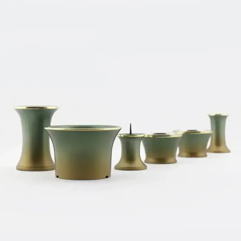 現代の小さな仏壇に合わせて作られたコンパクトな仏具セットです。スタイリッシュなフォルムがお仏壇に飾った際に優しい雰囲気を作りだします。緑茶マットの落ち着いた色合いとマットな仕上げの表面は、上品な祈りの場を創り出します。各仏具の開口部の縁取りはゴールドで高級感と存在感を高めます。