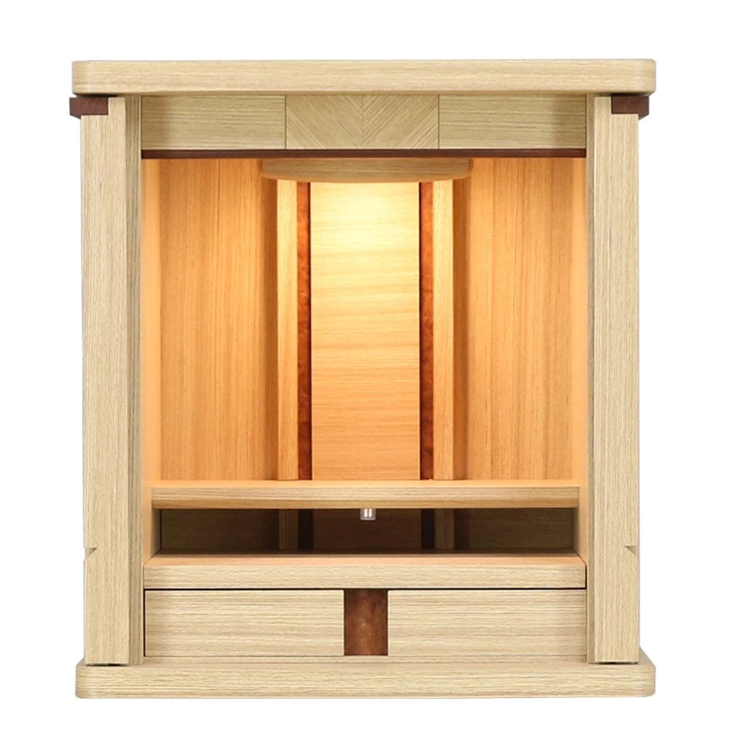 • 特 徴: LEDライト 、 扉スリム設計 、 スライド式内部段 、 引き出し収納 、 柾目の直線が多めの木目 、 セット仏壇の仏具シュミレーションあり 、 台の上に設置するタイプ 、 海外製