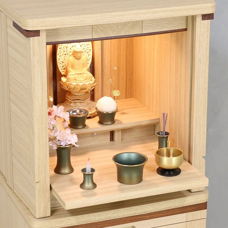 本尊には桧木仏像 丸台座 をセットしました。仏像の両脇のミニ常花は仏像を蓮花で引き立てるための仏具です。仏具には、どんな仏壇にも合わせやすい緑茶マット色の仏具をセット。色合いは和・洋どちらの空間にもマッチします。リンは、リン棒をリンの中に収納でき、従来のリンのような落ち着いた音色の煌リンをセットしました。
