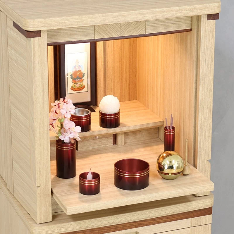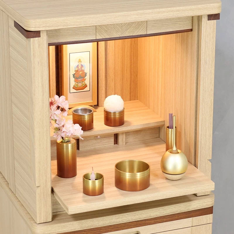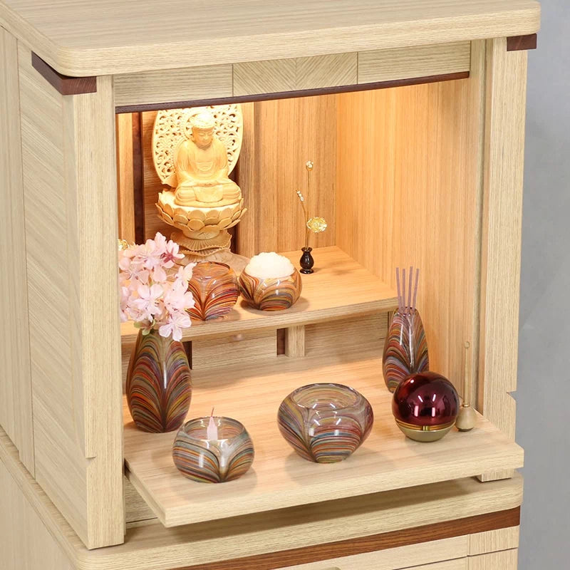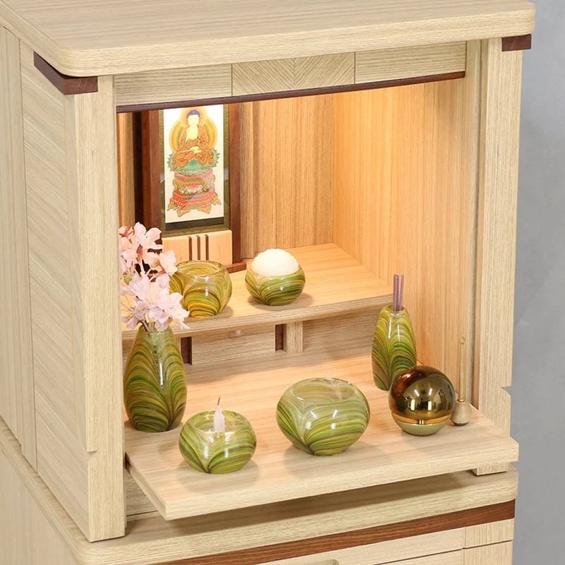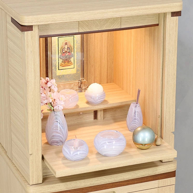 押し込み式の扉が特徴のスリムでコンパクトな上置きタイプのお仏壇です。生活スタイルに合わせ、自由にお祀りの方法を変えることが可能なシリーズで現代のニーズにそっと寄り添うお仏壇です。