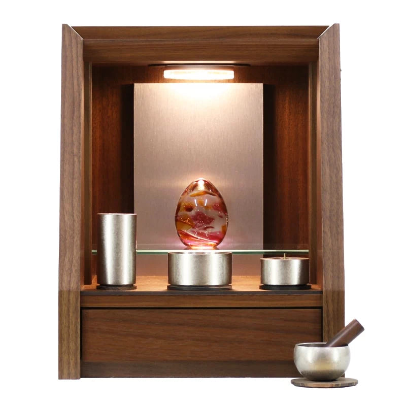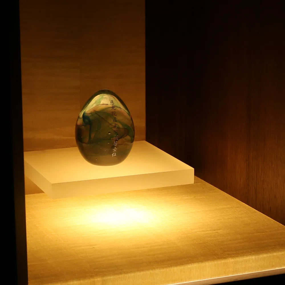 ガラス位牌ウフはお仏壇の中だけではなく手元供養としてそのまま身近なところにも飾って頂ける新しいタイプの商品です。