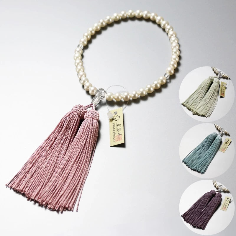 しっとりと上品に輝く淡水真珠を主玉に使用した女性用略式念珠です。略式念珠ですので宗派は問わず、どなたでもお使いいただけます。淡水真珠をメインに、アクセントの天玉と親玉は水晶切子がきらりと光ります。房の色はどれも優しい色味の4色展開です。年齢を問わず永くご愛用頂けるようなデザインに仕上がりました。