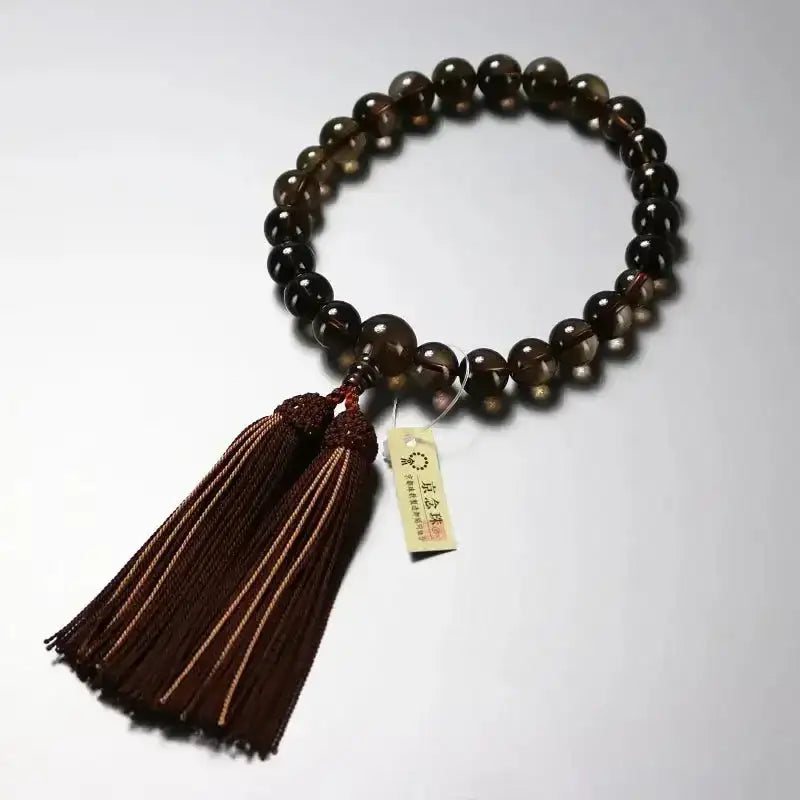 上品な茶色に澄んだ透明感が清々しい茶水晶を使用した男性用略式念珠です。略式念珠ですので宗派は問わず、どなたでもお使いいただけます。「疲れた心を癒す」とされる茶水晶は精神を安定させる効果があり、前向きになるように精神面を強力にサポートしてくれると云われています。房のお色は茶水晶のお色に合わせた檜皮色に、アクセントの琥珀色が全体を締めます。落ち着きのある大人の悠然とした印象で年齢を問わず永くご愛用頂けるようなデザインに仕上がりました。