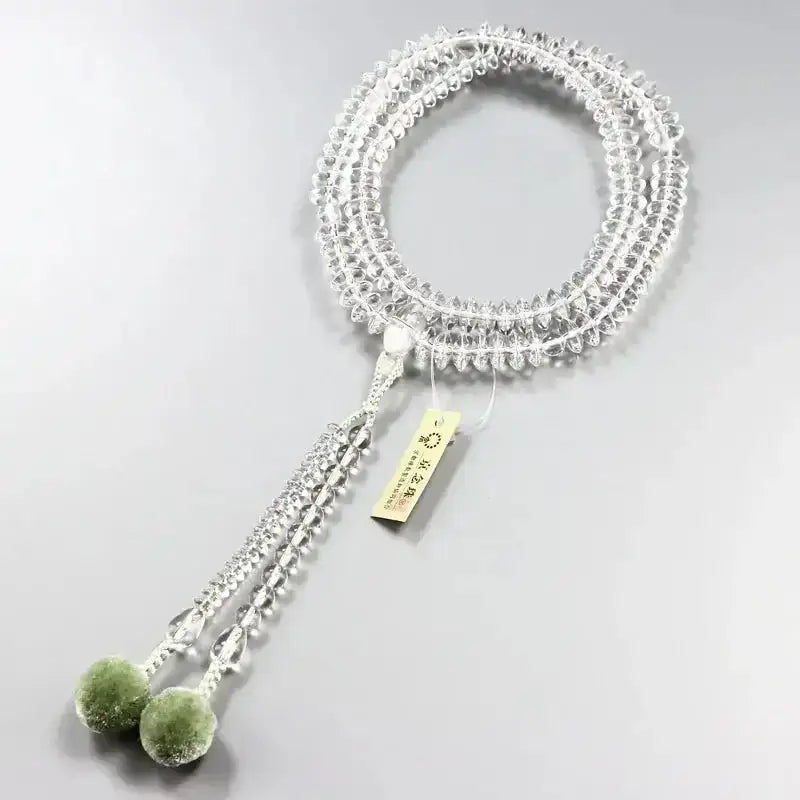 透き通る水晶と淡い白緑色の房が清楚で優しい印象の、天台宗の女性用本式念珠。
