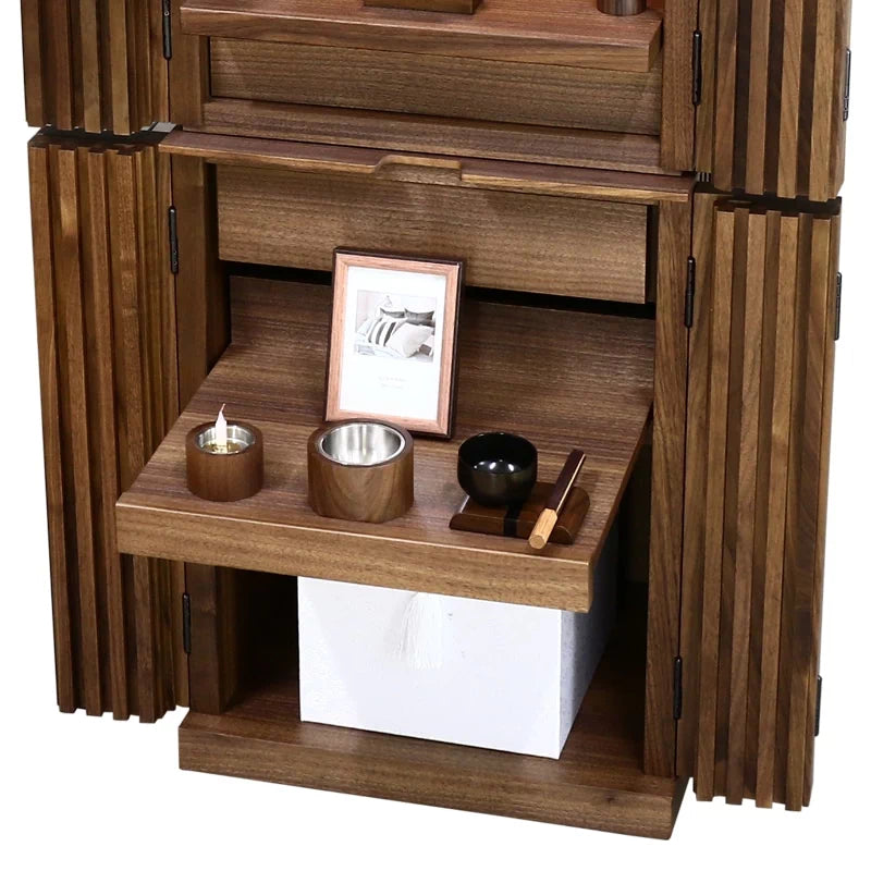可動式の本尊台、広々としたスライド式仏具板、2つの引き出し、4段階に調節できる下段と、さまざまな機能を備えています。また、最下部には納骨前の骨壺を納めていただける収納スペースがあり、高さを調節することで、お盆飾りなども入れていただけます。