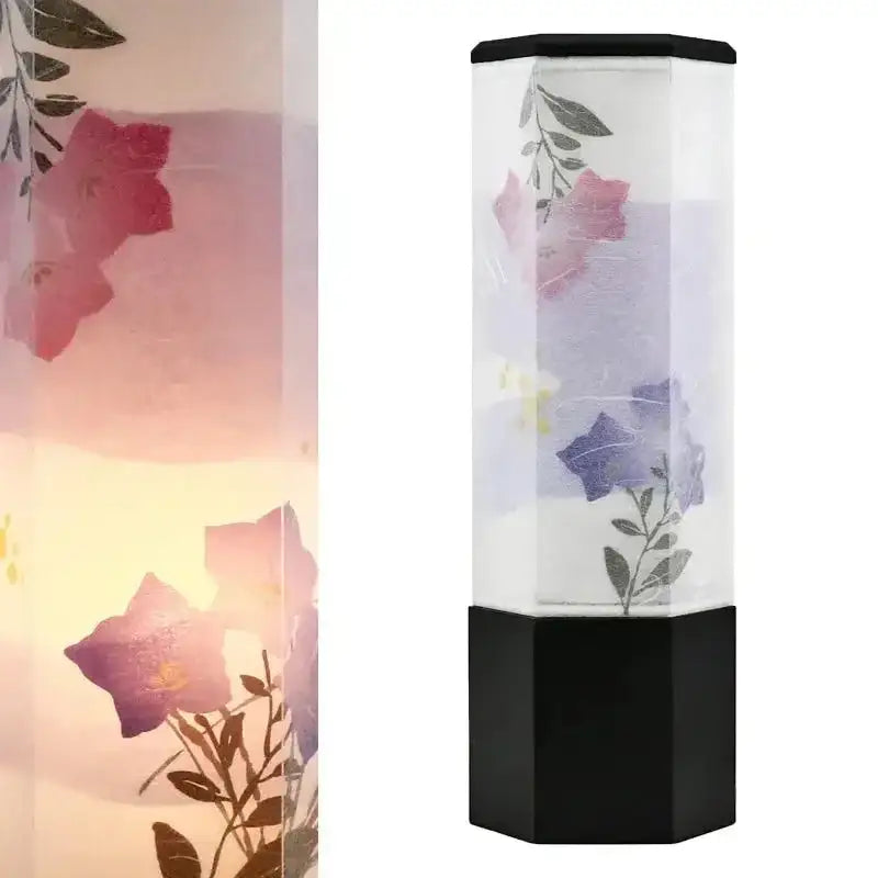 黒の台座に上品な桔梗が映えるモダン行灯。コンパクトなサイズで場所を取らず、熱電球の温かみある光が和紙を通してふんわりと灯ります。お盆の時期だけでなく通年ご使用いただけるデザインの行灯です。組立不要なタイプで、台座と火袋部分は磁石で固定されております。
