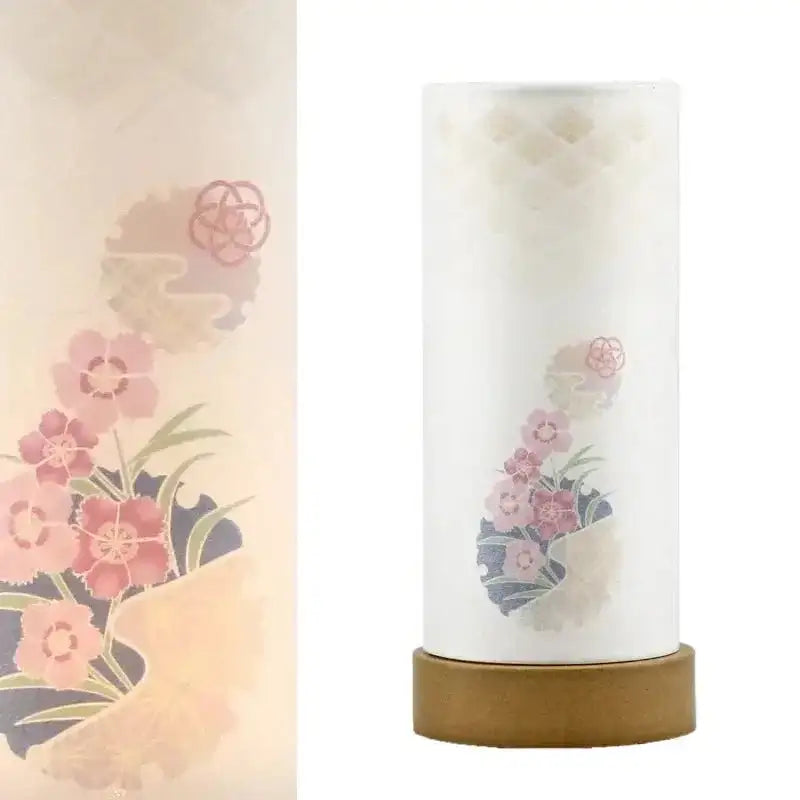 撫子の花と古典柄が可愛らしい印象のモダン行灯、コンパクトなサイズで場所を取らず、LEDライトの温かみある光が和紙を通してふんわりと灯ります。お盆の時期だけでなく通年ご使用いただけるデザインの行灯です。組立不要で、すっきりとしたコードレスタイプです。