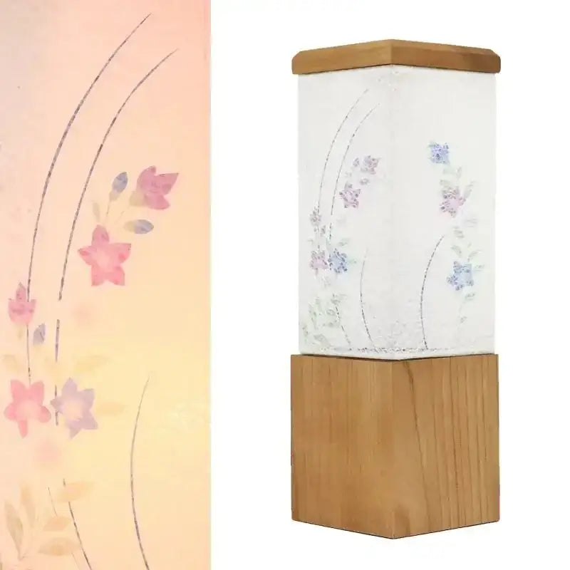 レトロな桔梗の絵柄が可愛らしい印象のモダン行灯、コンパクトなサイズで場所を取らず熱電球の温かみある光が和紙を通してふんわりと灯ります。また虹色に光るLEDのオーロラライトも付属しておりますのでお好みでお取替えいただけます。お盆の時期だけでなく通年ご使用いただけるデザインの行灯です。