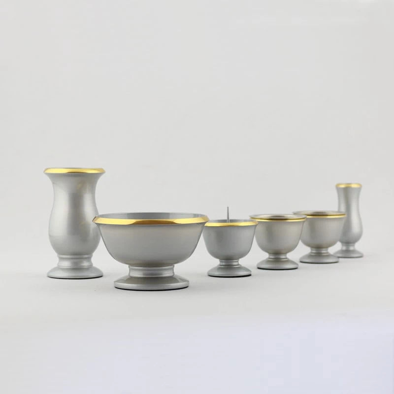 涼し気な爽やかなシルバーに近いブルーの色合いの仏具セット。3点セット、6点セットからお選び頂けます。