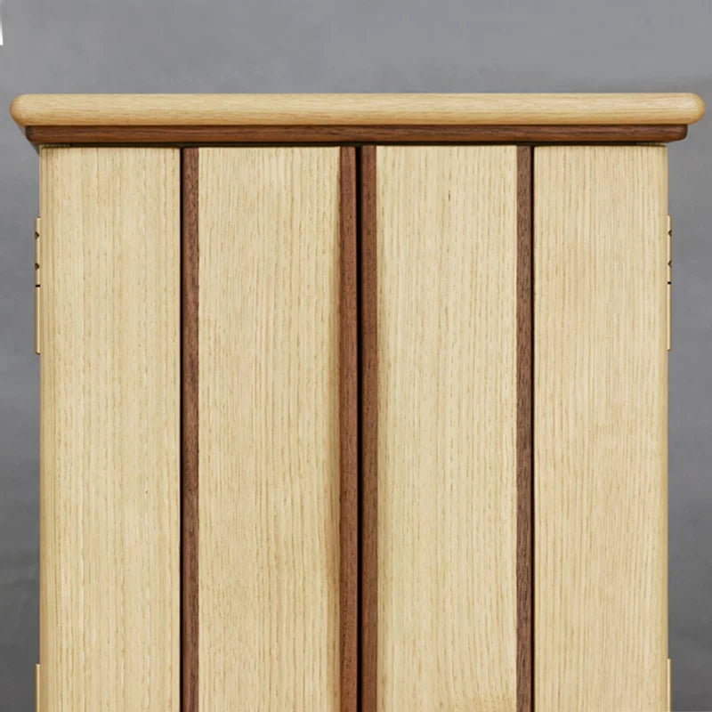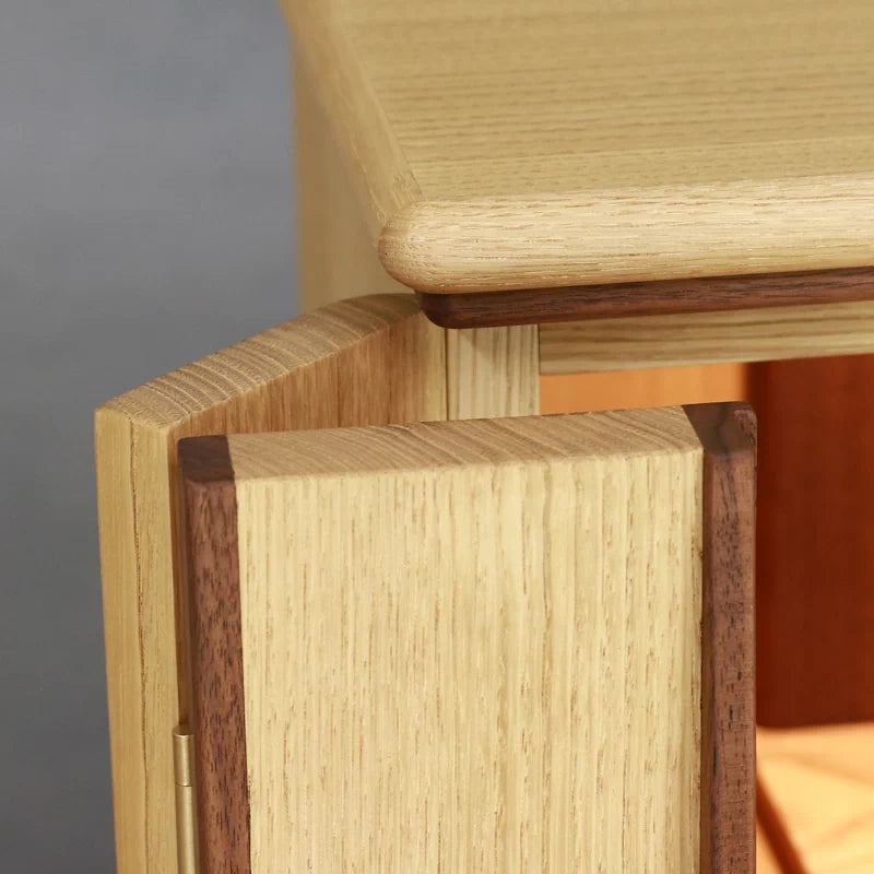 クリとクルミの無垢材を「板目」と「柾目」を異なる木目の取り方がされており、ダイナミックな無垢材の息吹を感じていただけます。丸みを帯びたフォルムと、2つの木材を意匠的に組み合わせた上置きタイプのお仏壇です。
