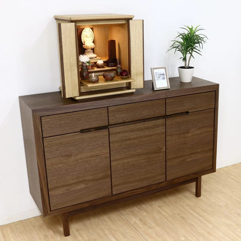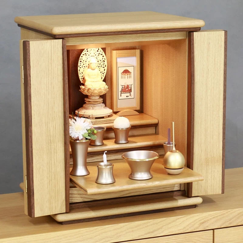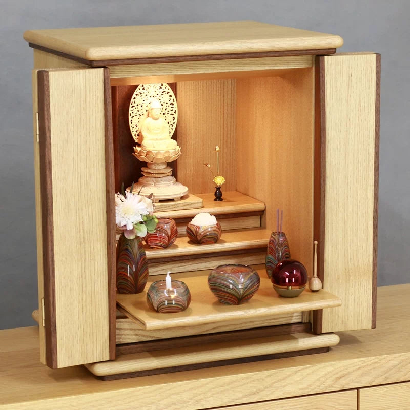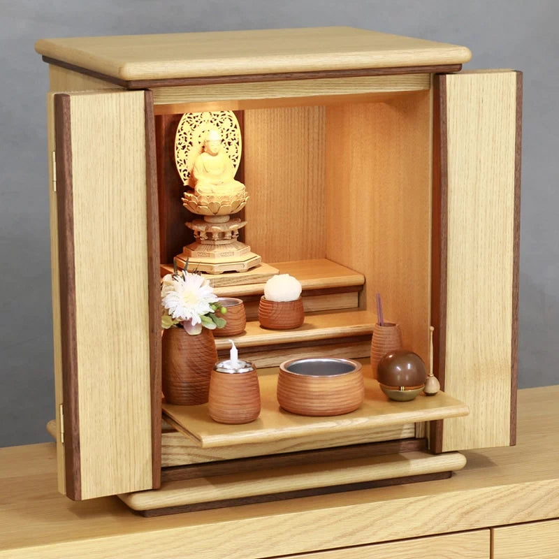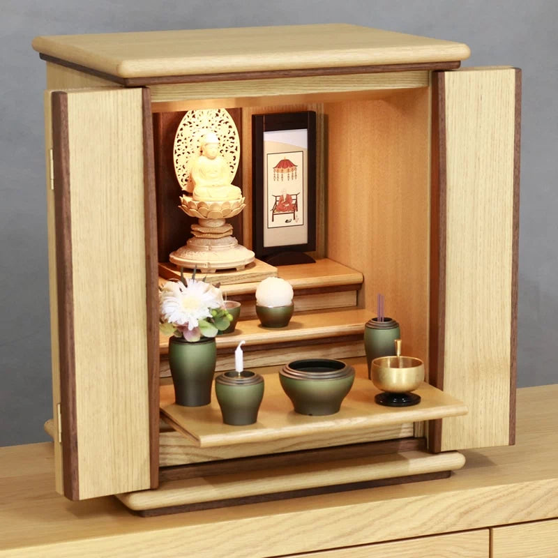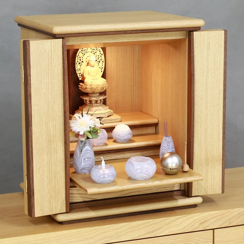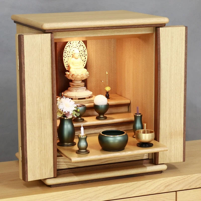 • 特 徴: 国産品 、 LEDライト 、 無垢材3割以上 、 板目の曲線が多めの木目 、 須弥壇取り外し可能 、 仏具板 、 引き出し収納 、 セット仏壇の仏具シュミレーションあり 、 台の上に設置するタイプ 、 本尊台あり