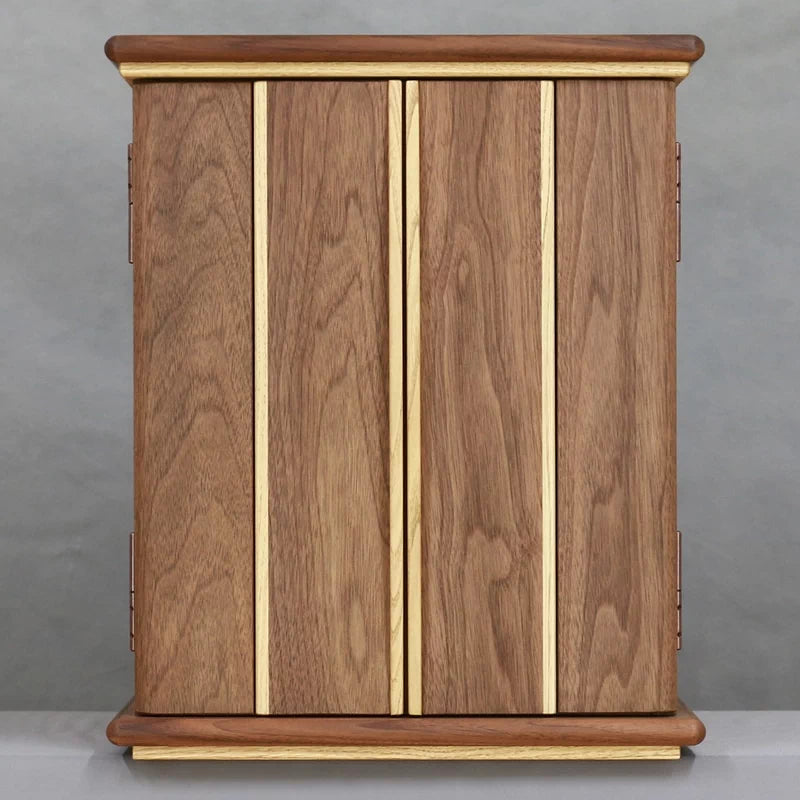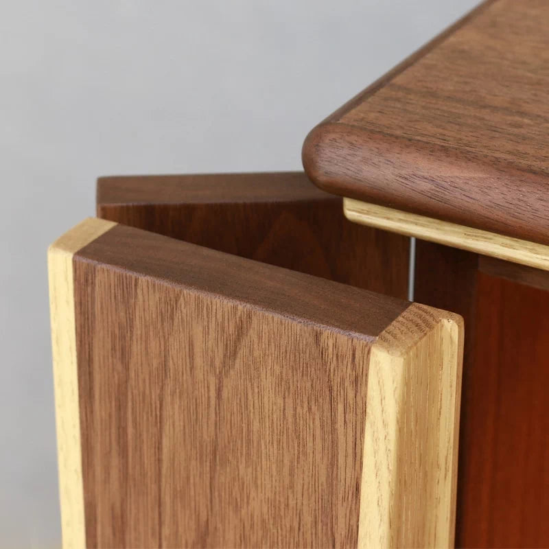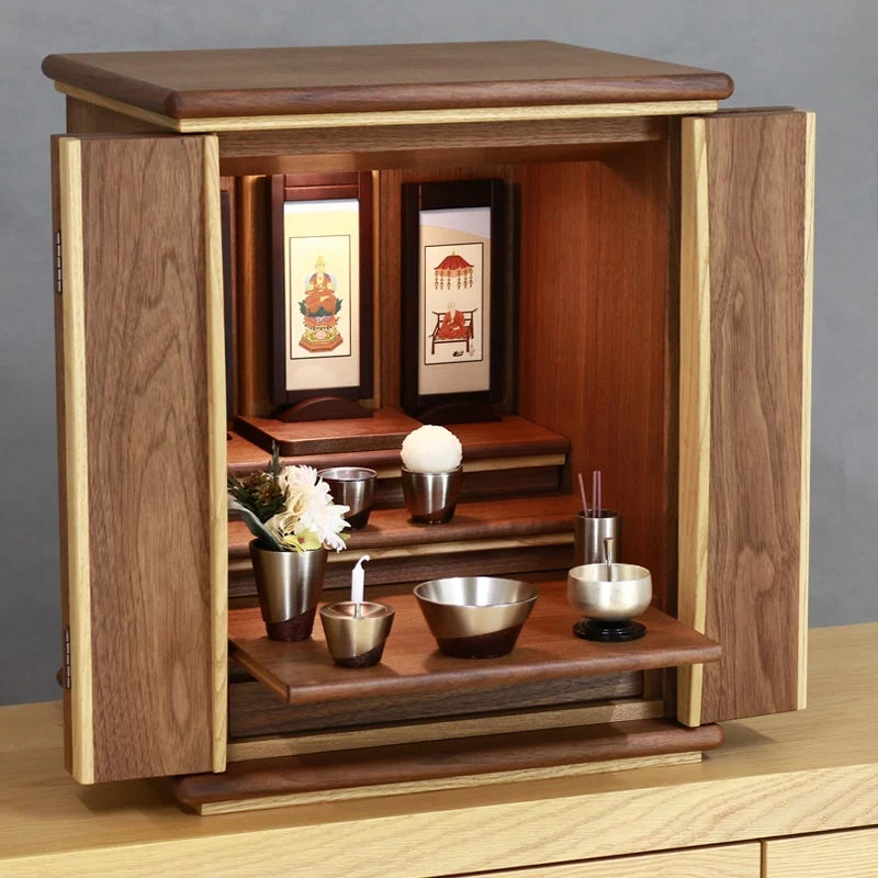 クリとクルミの無垢材を「板目」と「柾目」を異なる木目の取り方がされており、ダイナミックな無垢材の息吹を感じていただけます。丸みを帯びたフォルムと、2つの木材を意匠的に組み合わせた上置きタイプのお仏壇です。