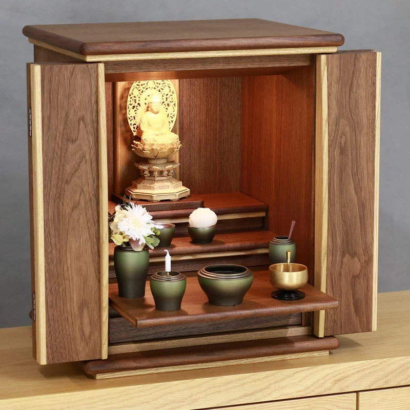 • 特 徴: 国産品 、 LEDライト 、 無垢材3割以上 、 板目の曲線が多めの木目 、 須弥壇取り外し可能 、 仏具板 、 引き出し収納 、 セット仏壇の仏具シュミレーションあり 、 台の上に設置するタイプ 、 本尊台あり