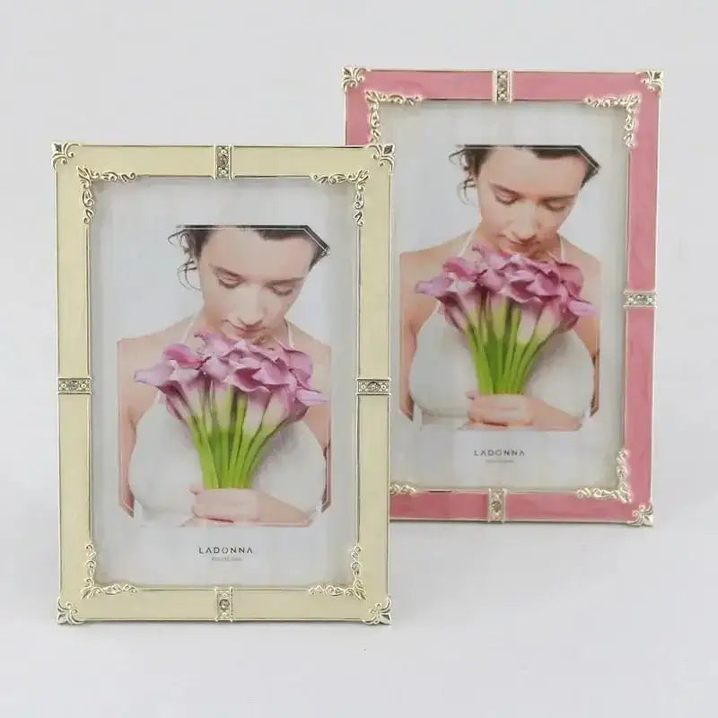 パールカラーの額にシルバーとクリスタルの装飾が施された、繊細で華やかなデザインのフォトスタンドです。大切な方のお写真や思い出のお写真をお入れいただけます。