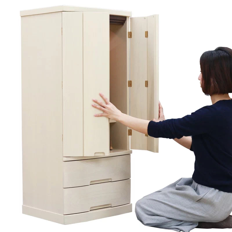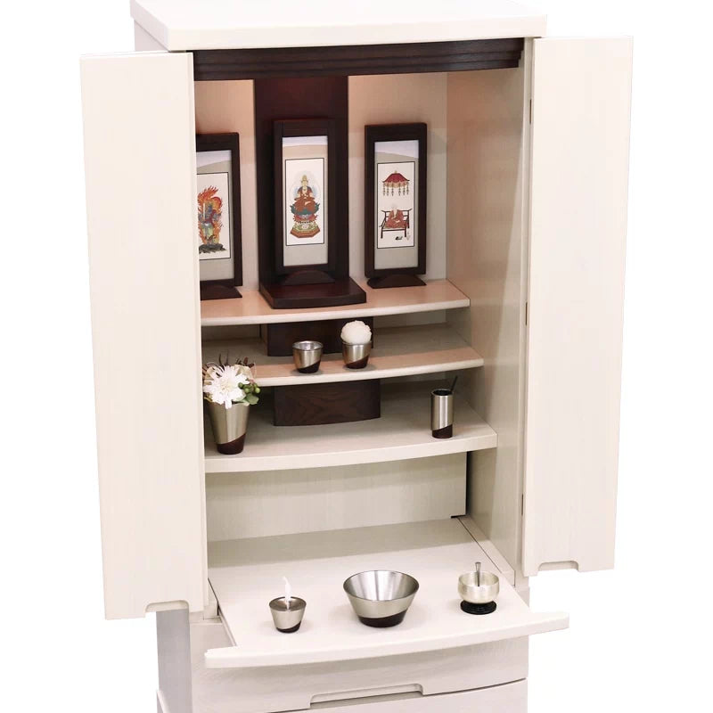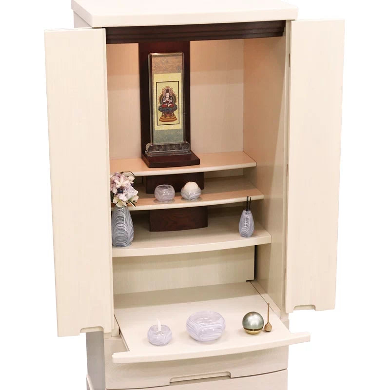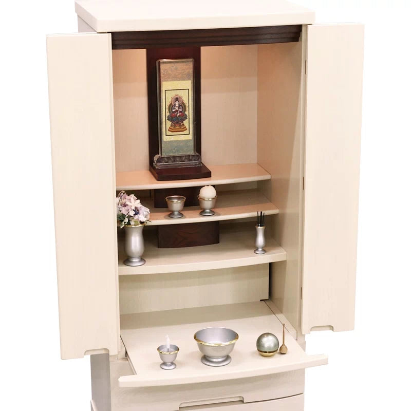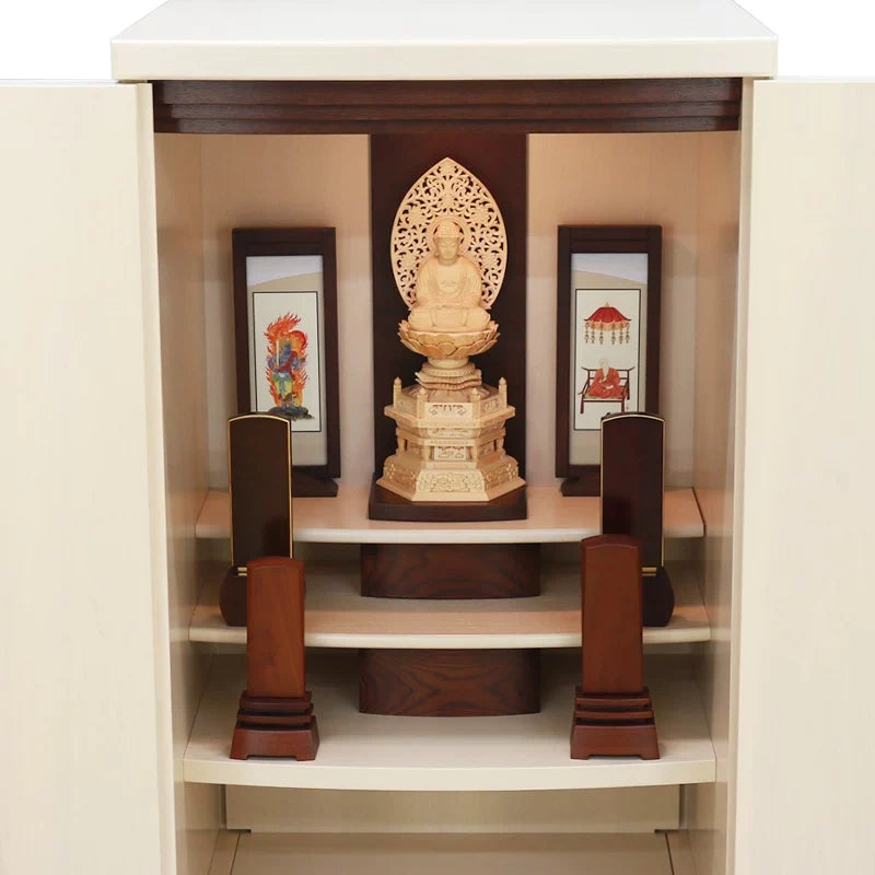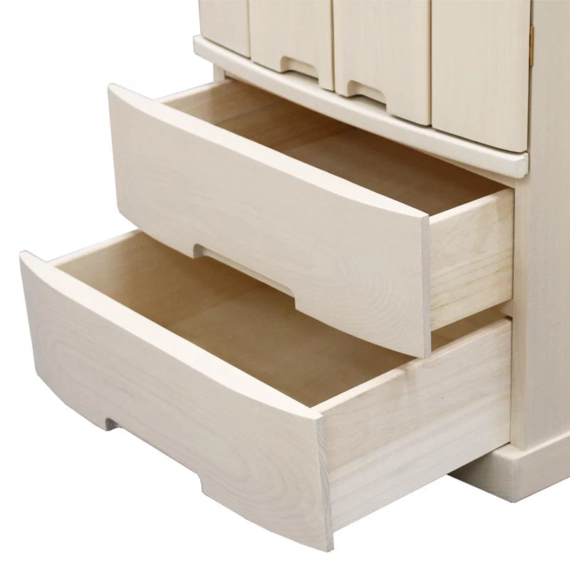 木材は強さに定評のあるタモ材を使用。扉は総無垢材、その他も厚板貼りととてもふんだんに木材を使用した高スペックな作りとなっております。表面にはウレタン塗装を施し、熱・水・キズから木材をしっかりと保護しております。やわらかなクリームホワイトのお色で、お部屋のインテリアとも馴染みます。国産の高品質なお仏壇ですので安心して末永くお使い頂けます。
