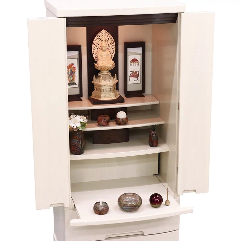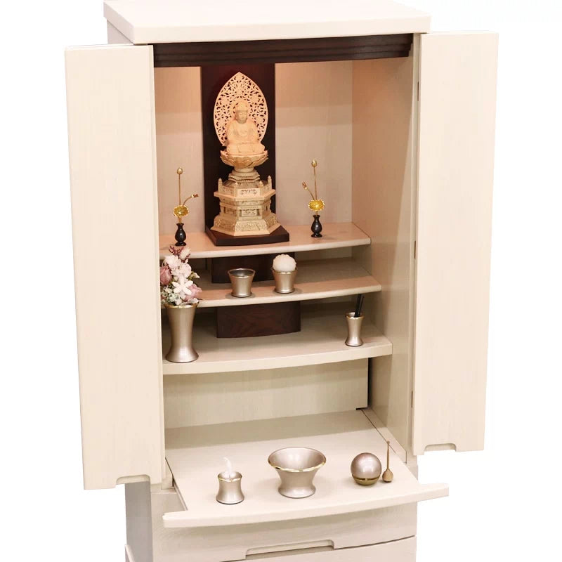 お仏壇内部が広い自立式の国産仏壇。クリームホワイトがやわらかな色合い。
