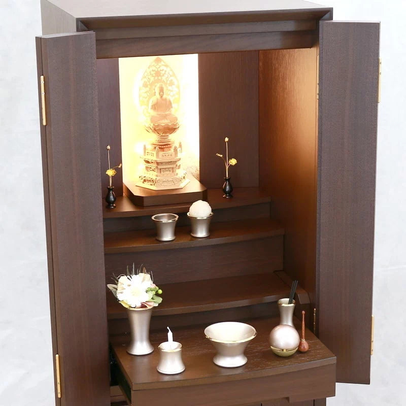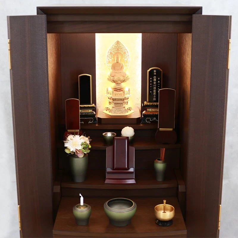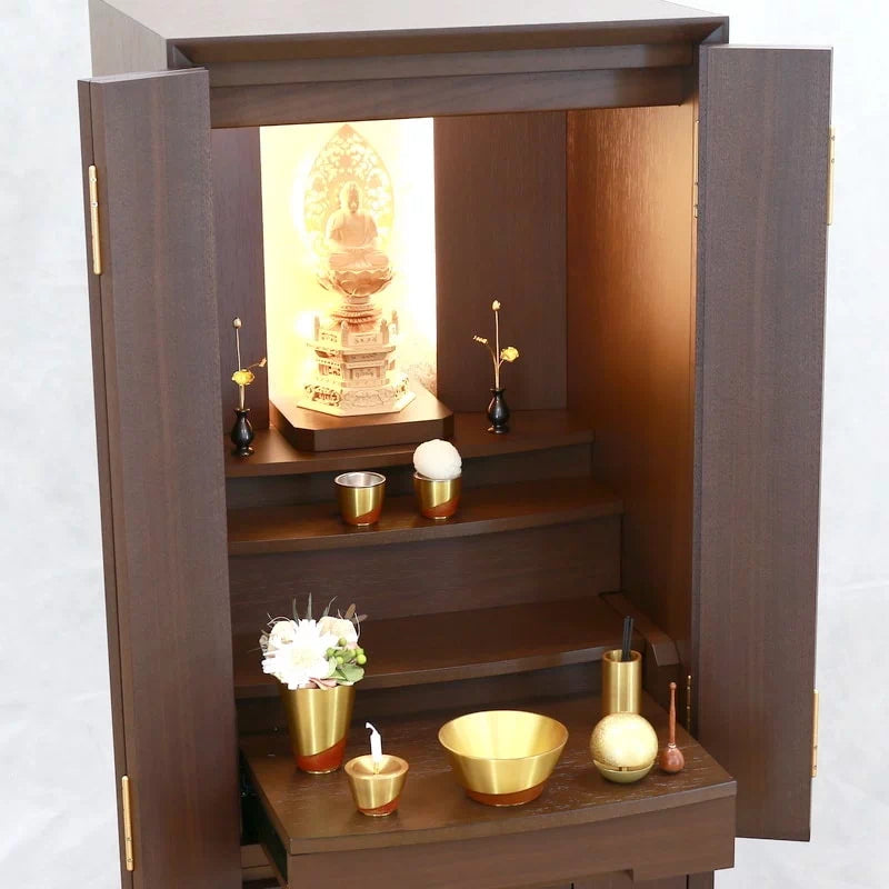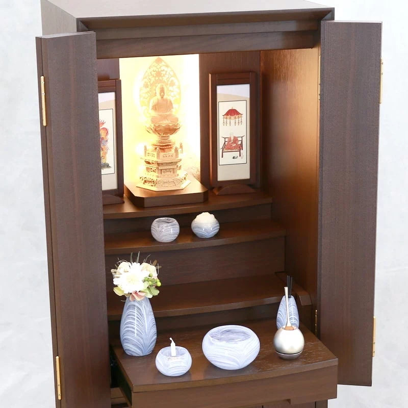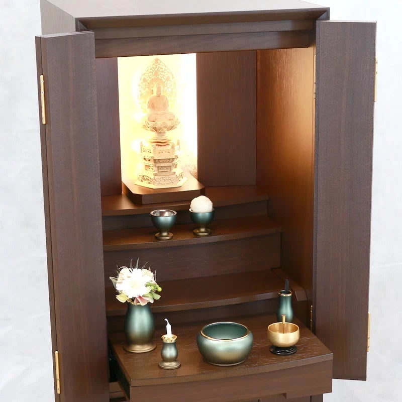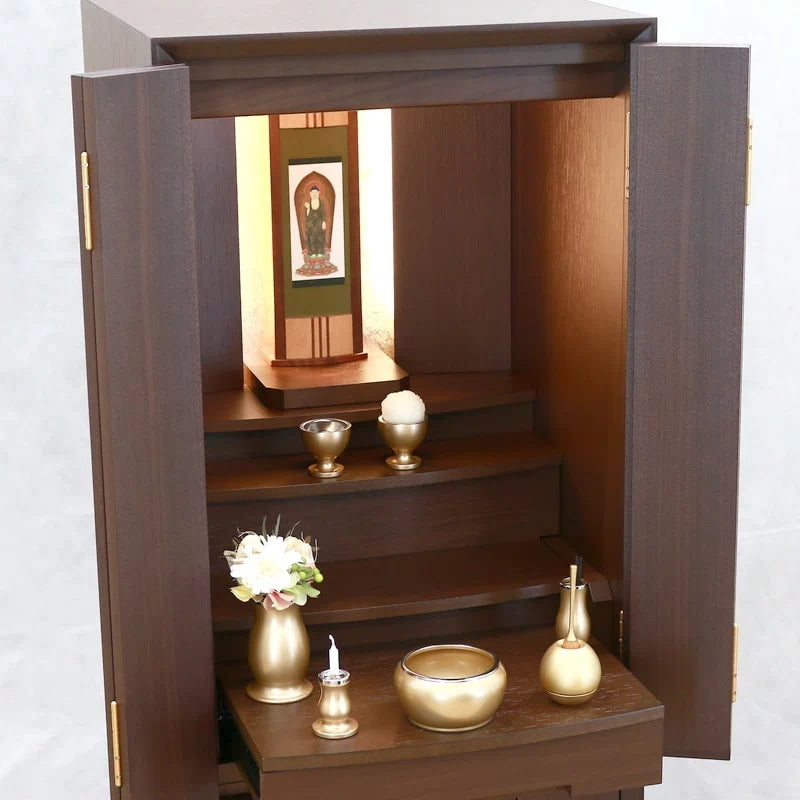 • 特 徴: 国産品 、 LEDライト 、 本尊台あり 、 スライド式内部段 、 引き出し収納×2 、 7寸骨箱収納可能 、 経机付き 、 柾目の直線が多めの木目 、 床置きタイプ 、 セット仏壇の仏具シュミレーションあり
