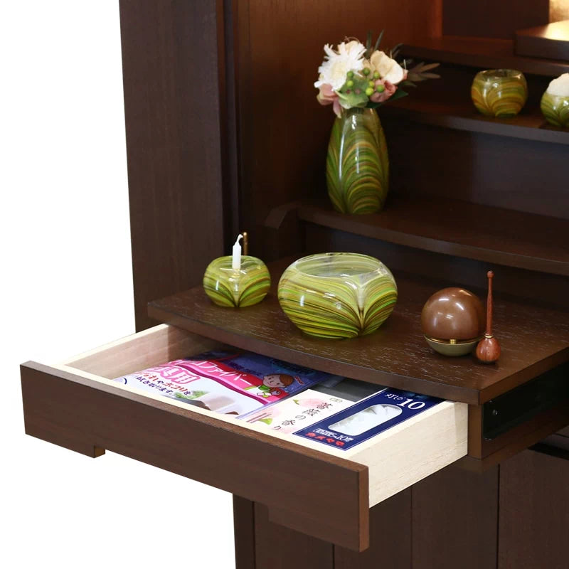 • 中間部のスライド式仏具板の下には、引出しが内蔵されており、少ないスペースで2つの機能を兼ね備えています。引出しには故人様の思い出の品や、お仏壇周りの仏具や小物などをお納めいただけます。スライド式仏具板を引き出すことで、ゆったりとしたスペースでお祀りいただけます。