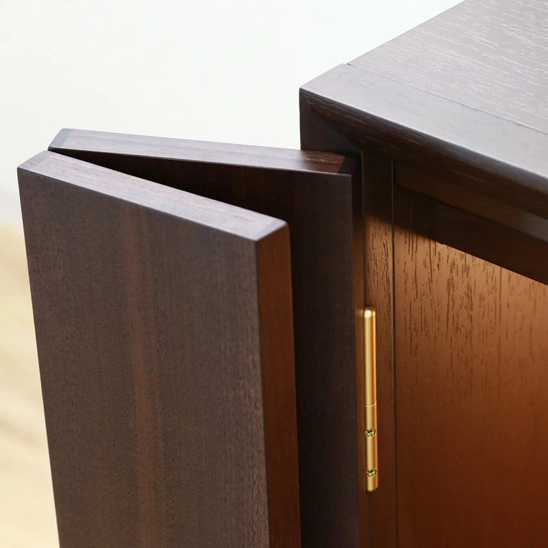 • お仏壇正面のコーナー部分は、「留め組仕上げ」が施されています。そのため、扉は直角に開くのではなく斜めに開きます。また、扉の蝶番はお仏壇の側面ではなく、内側に固定されており、幅を取らない設計です。
