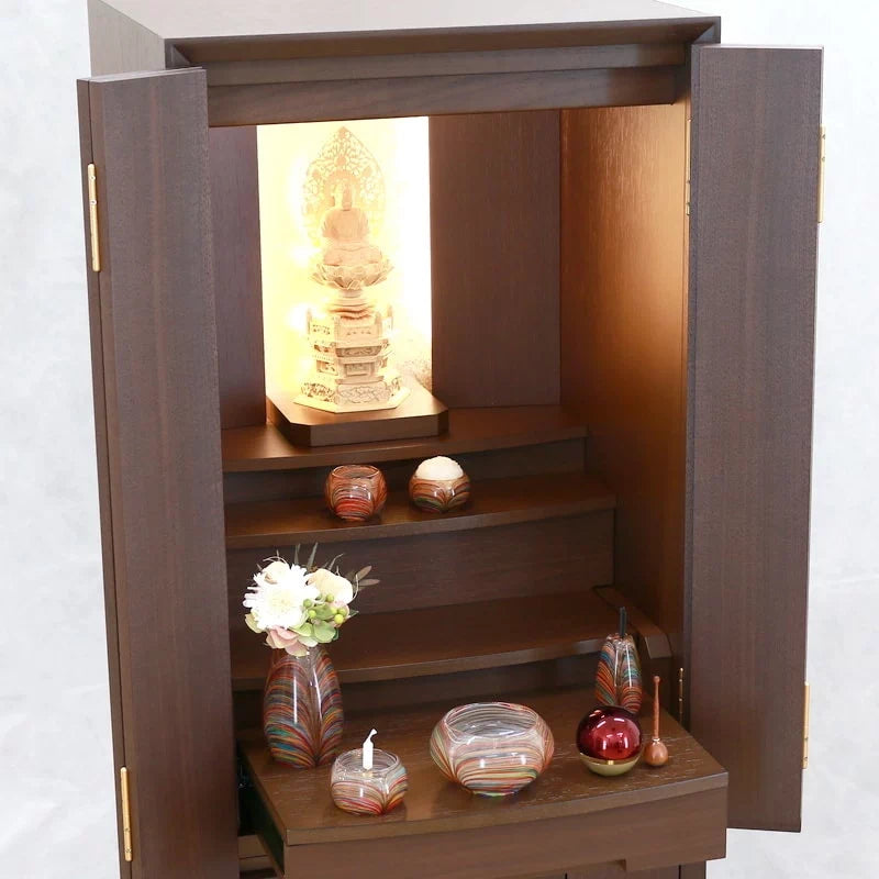 本尊には本柘植製の高級仏像をセット。本柘植はとても硬い木ですので細かい彫りが特徴です。仏具は当店オリジナル「津軽びいどろirodori」をセレクト。夏の花火をコンセプトにした華やかなデザインで、お仏壇に彩を添えます。おリンはグッドデザイン賞受賞のたまゆらリンシリーズのレッドをチョイス。落ち着いた色合いに仏具とおリンが華やかさをプラスします。