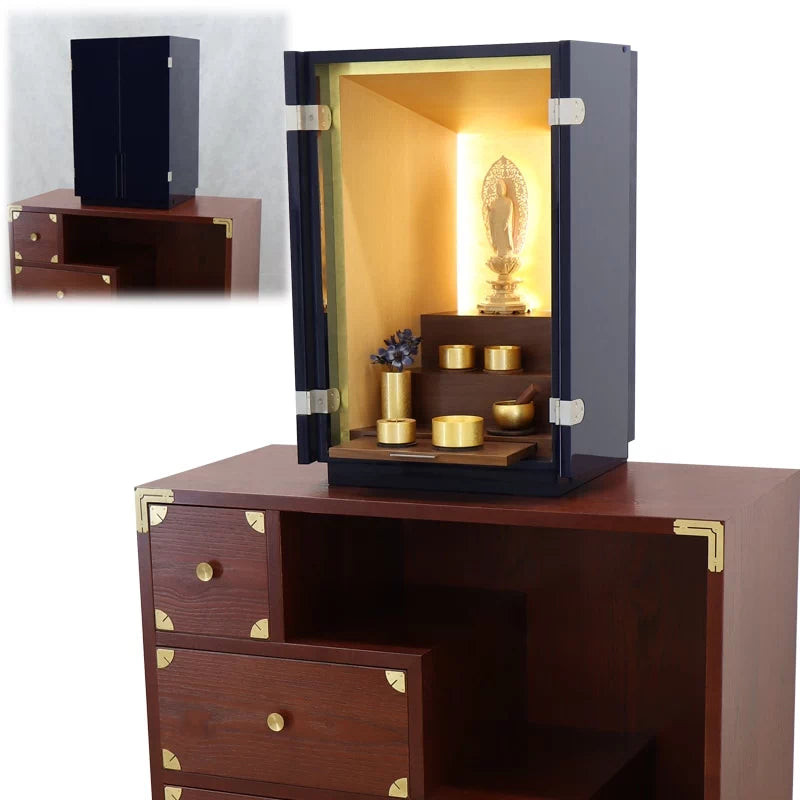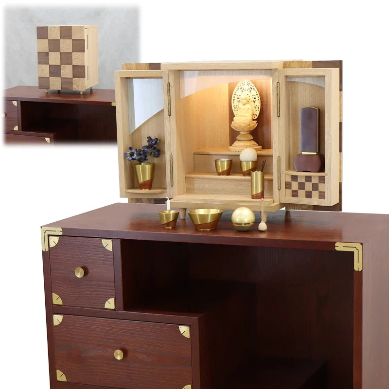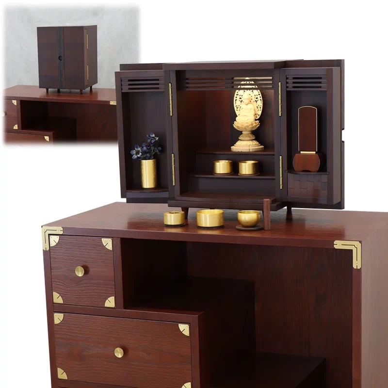 近年、お客様の購入内容をみると当店では「家具(サイドボード・チェスト)」の販売が非常に多くなっており、現在では仏壇台よりも出荷台数は多くなっております。お仏壇を家具と合わせて頂くことでお仏壇周りの雰囲気も一段とおしゃれにコーディネートして頂けます。一方、仏壇台の方は「仏具を置くスライド板」が設置されているものが多いのと、仏壇と同じメーカーが色を合わせて製作しているシリーズも一部あります。