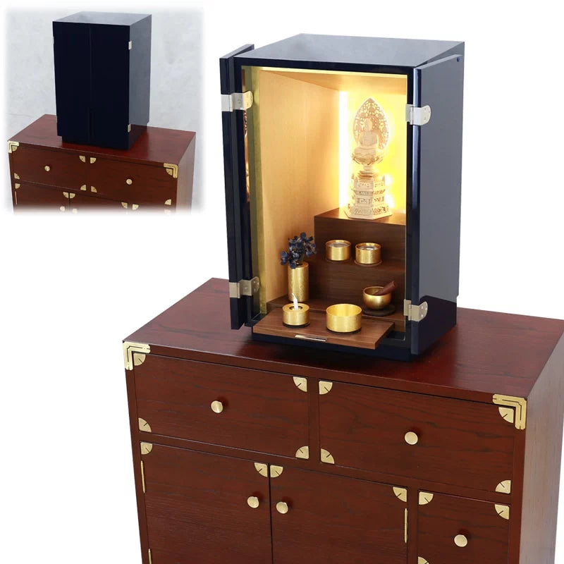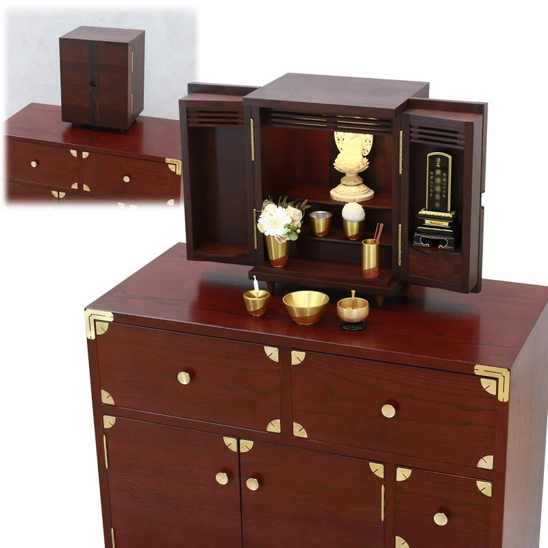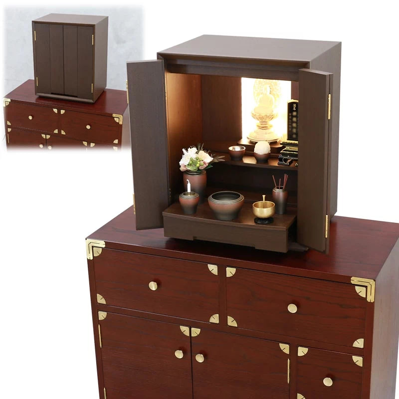 近年、お客様の購入内容をみると当店では「家具(サイドボード・チェスト)」の販売が非常に多くなっており、現在では仏壇台よりも出荷台数は多くなっております。お仏壇を家具と合わせて頂くことでお仏壇周りの雰囲気も一段とおしゃれにコーディネートして頂けます。一方、仏壇台の方は「仏具を置くスライド板」が設置されているものが多いのと、仏壇と同じメーカーが色を合わせて製作しているシリーズも一部あります。