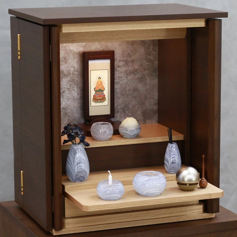 扉の開き方が特徴的なコンパクトサイズのモダン仏壇。おしゃれな背面の石目調のデザイン。