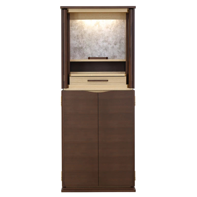 ウォールナットとタモの2種類の木材と、ご本尊背面のパターンとが美しく組み合わさったルミエールオリジナルの台付き仏壇です。直線のラインが華美すぎないすっきりとした佇まいで、現代のお部屋にも自然と溶け込みます。