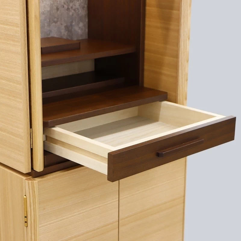 スライド式内部段の下には引出しが内蔵され、故人様の思い出の品やお仏壇周りの仏具などをお納めいただけます。