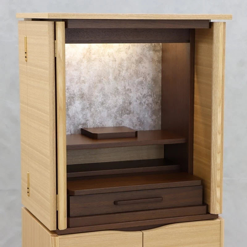 タモとウォールナットの2種類の木材と、ご本尊背面のパターンとが美しく組み合わさったルミエールオリジナルの台付き仏壇です。直線のラインが華美すぎないすっきりとした佇まいで、現代のお部屋にも自然と溶け込みます。