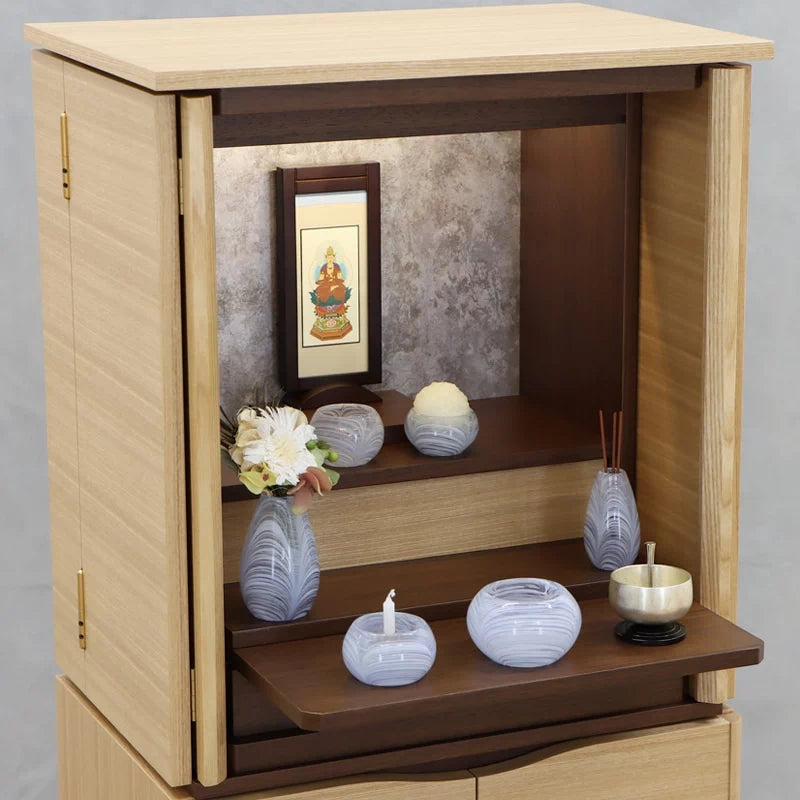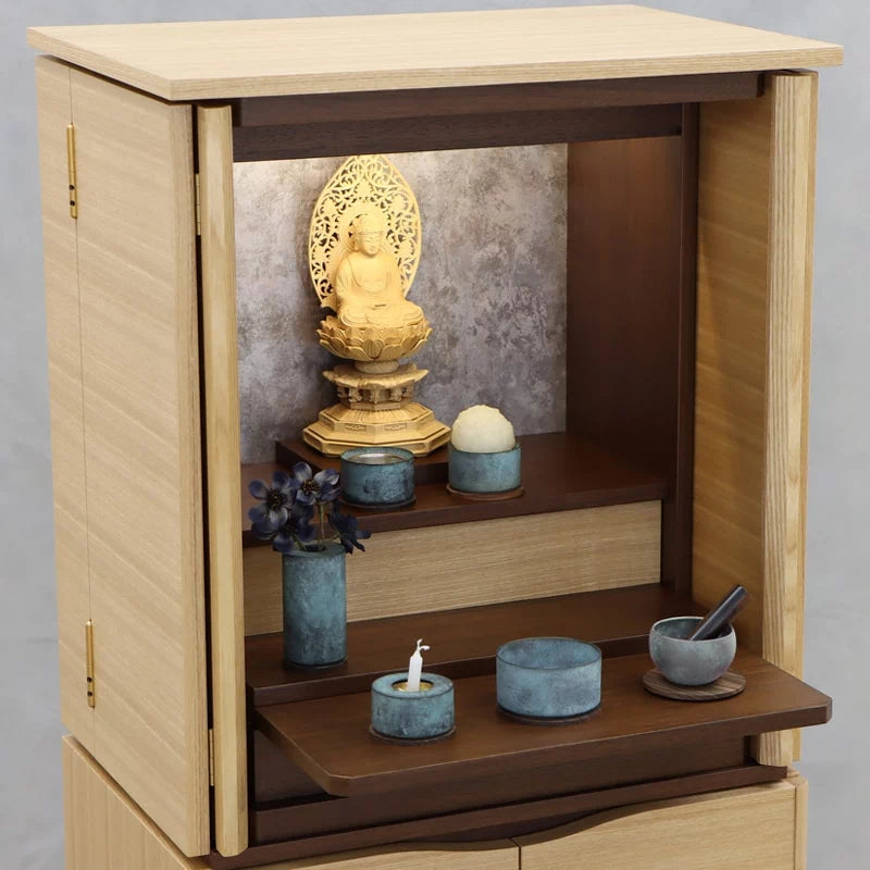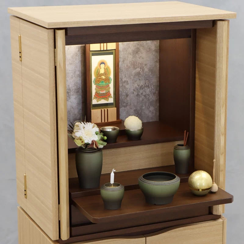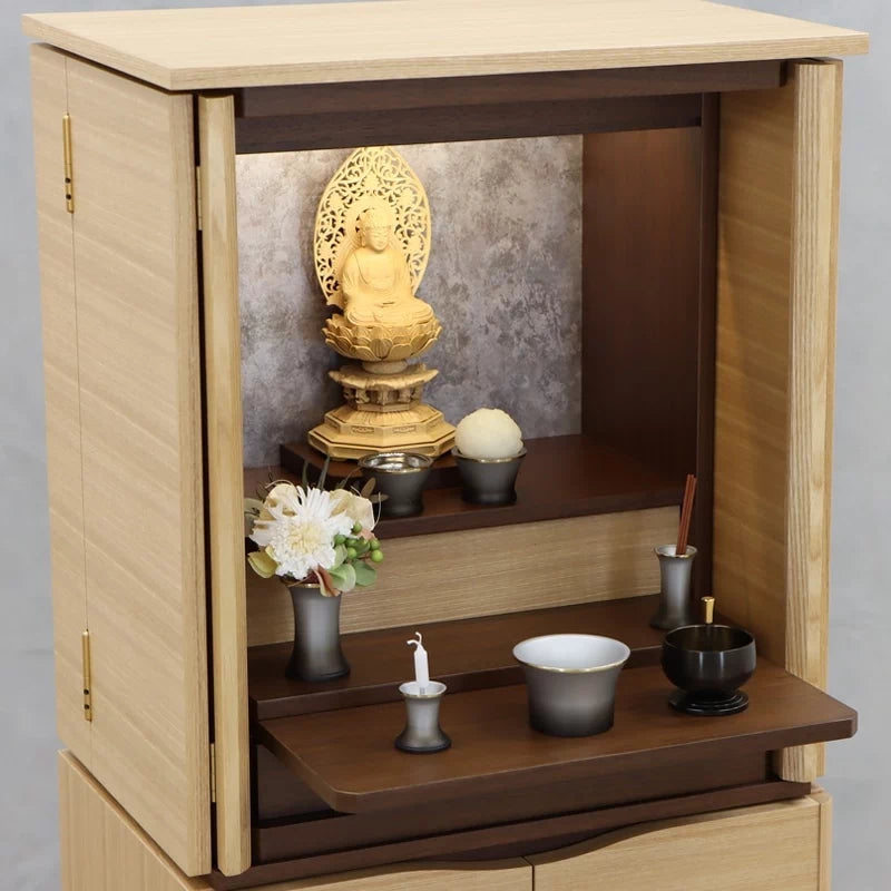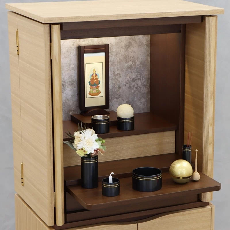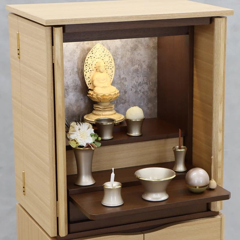 • 特 徴: 国産品 、 LEDライト 、 扉スリム設計 、 本尊台あり 、 スライド式内部段 、 引き出し収納 、 7寸骨箱収納可能 、 柾目の直線が多めの木目 、 床置きタイプ 、 セット仏壇の仏具シュミレーションあり