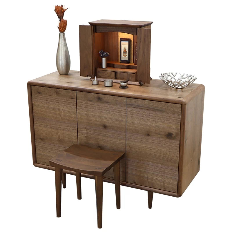 木工家具で有名な福岡県大川の工房で作られた家具。ウォールナットの質感と木目を際立たせるシンプルなデザインで、上に置くお仏壇や仏具とも調和します。