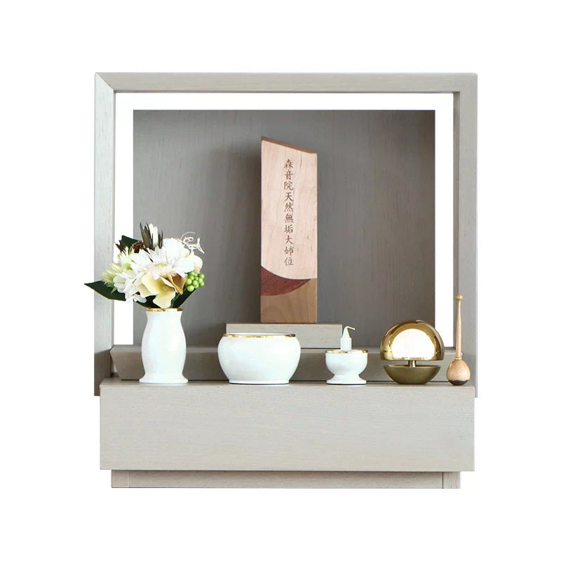 ミニサイズの仏具セット。フェミニンでかわいらしいホワイトカラー。