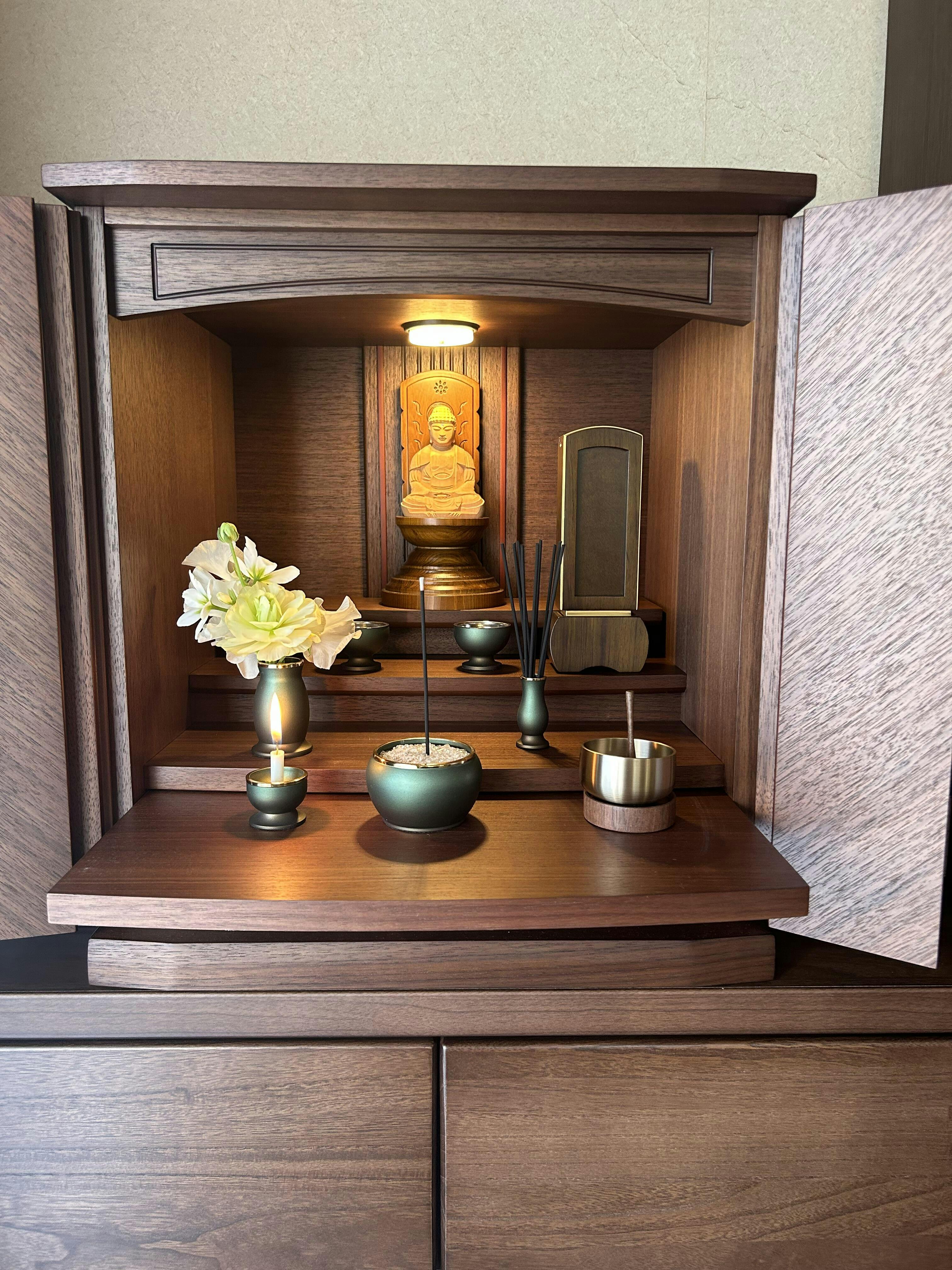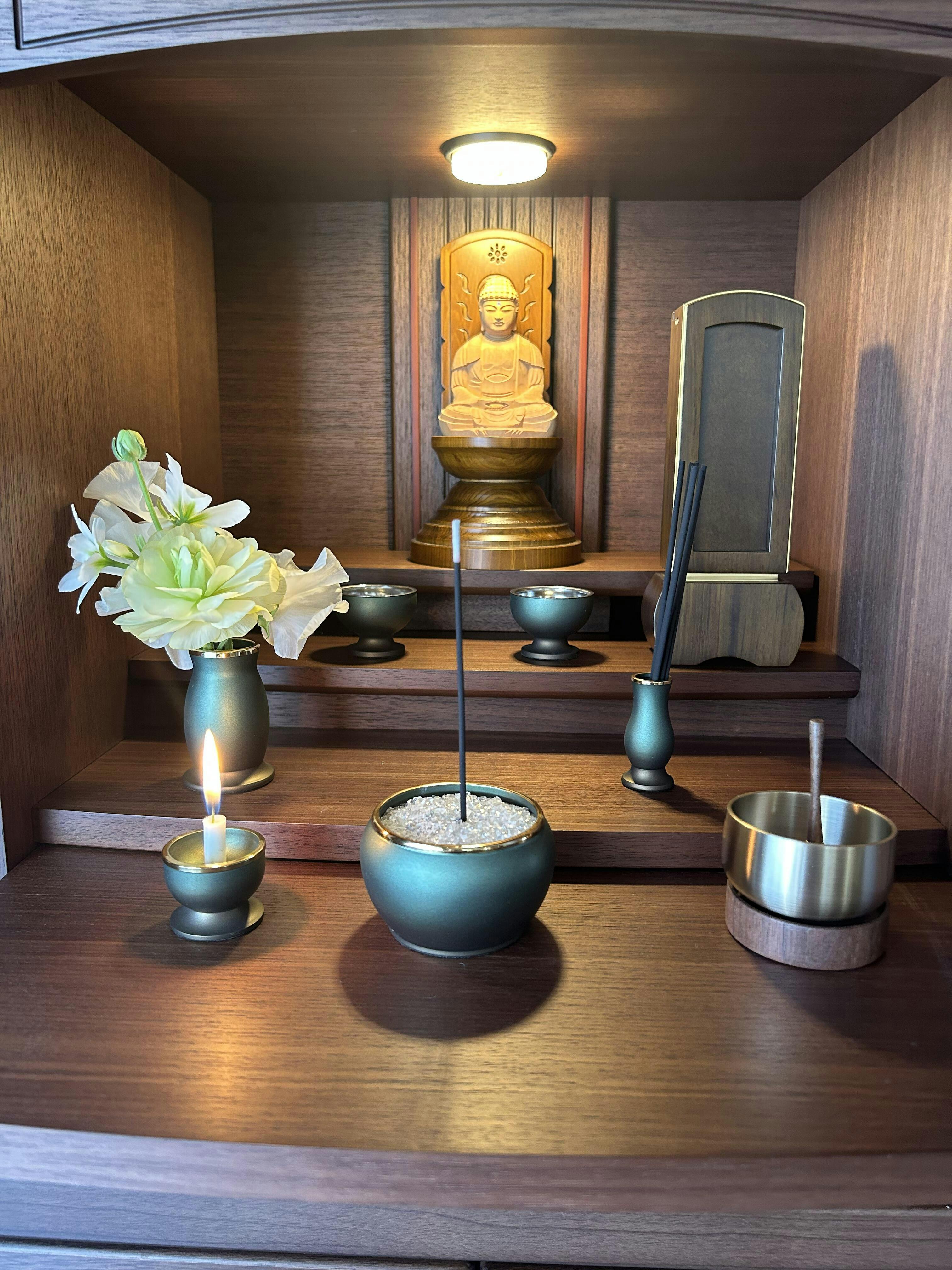 仏具によって荘厳(しょうごん)して初めてお仏壇としての意味を持ちます。仏具はご本尊を供養するのと共に、ご先祖様や亡き人を供養するためのものです。