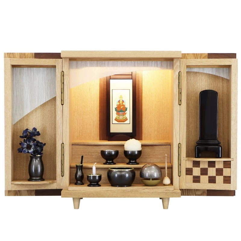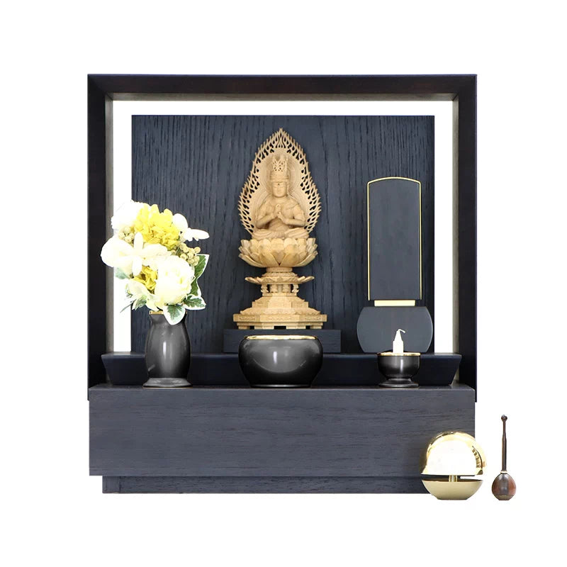 祈りの場をスタイリッシュに演出する、上品なパール調のシルバーグレーです。各仏具の開口部の縁取りが高級感と存在感を高めます。