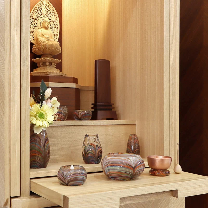 日本の伝統工芸「津軽びいどろ」とルミエールのコラボで誕生したふくろうのオブジェ。青森県伝統工芸士・篠原義和氏が一つ一つ丁寧に手作りしています。仏具セットやリンセットと合わせ、縁起物としてお仏壇に飾るのもおすすめです。