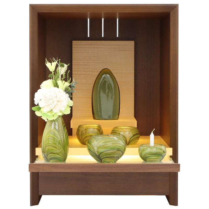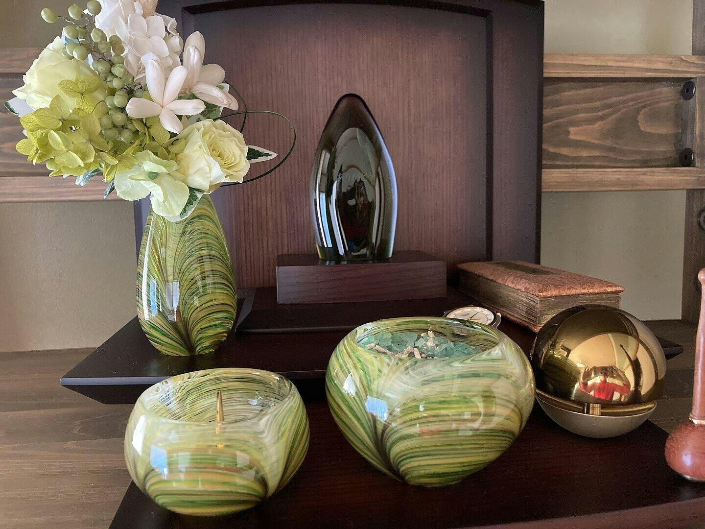 優し気な印象の深みのあるオリーブグリーンのガラス位牌。青森県伝統工芸「津軽びいどろ謹製」