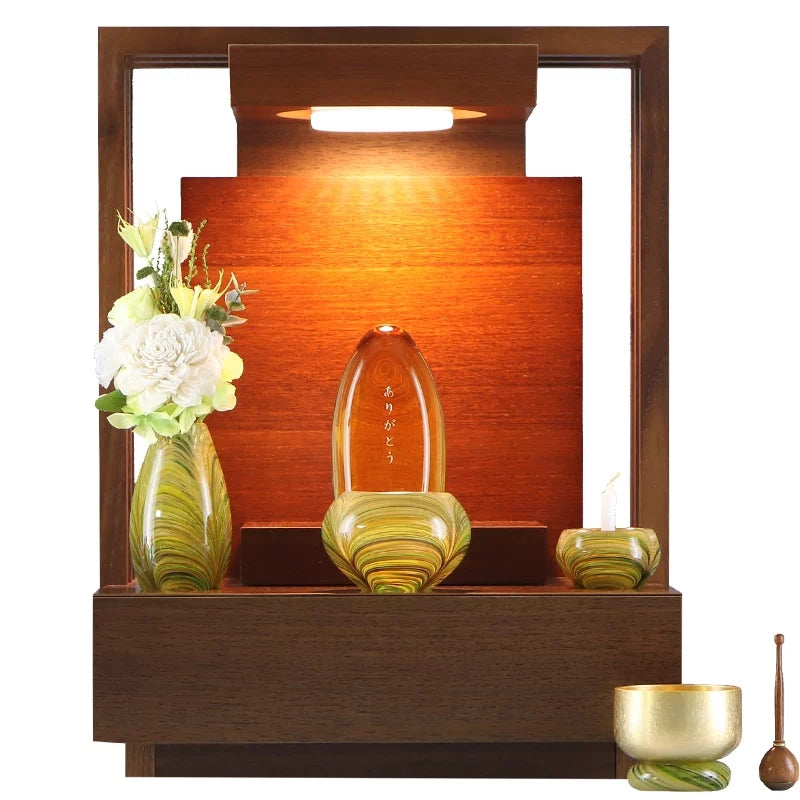今年のトレンドカラーのアンバー色の琥珀は重厚感もあり木製のお仏壇にマッチする商品です。女性作家ならではの繊細なフォルムとカラーは故人様を祀るに相応しい仕上がりになりました。数ある仏壇店の中から当店をお選び頂き有難うございました。